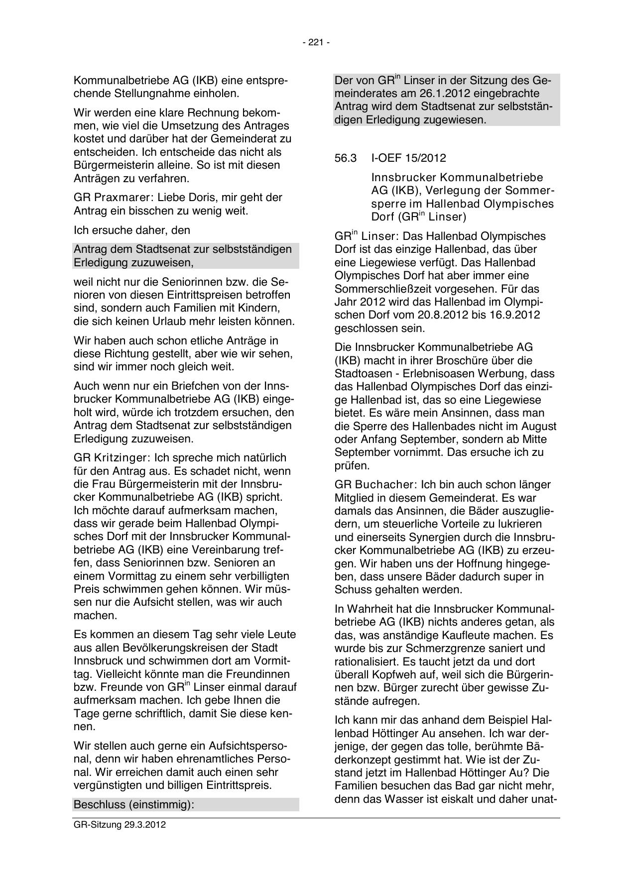 Der von GRin Linser in der Sitzung des Gemeinderates am 26.1.2012 eingebrachte