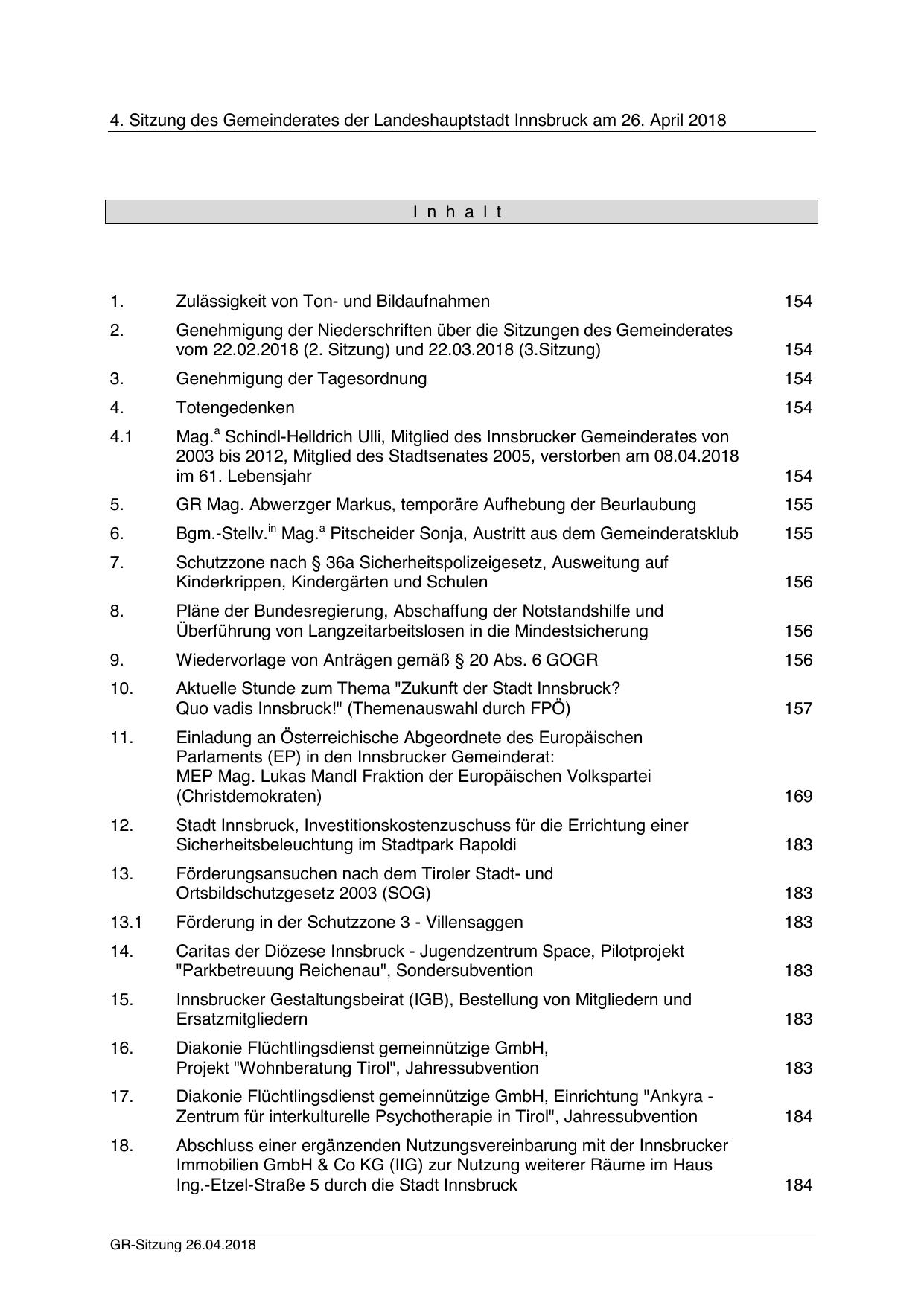 4. Sitzung des Gemeinderates der Landeshauptstadt Innsbruck am 26. April 2018