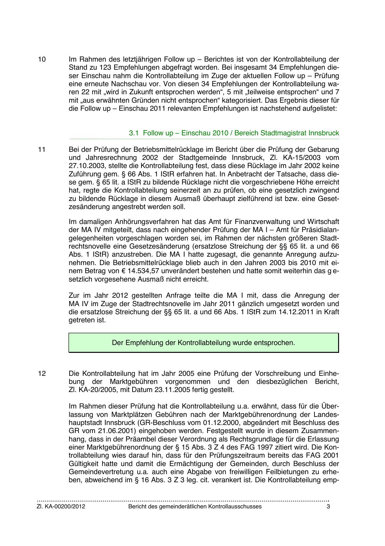 3.1 Follow up – Einschau 2010 / Bereich Stadtmagistrat Innsbruck
