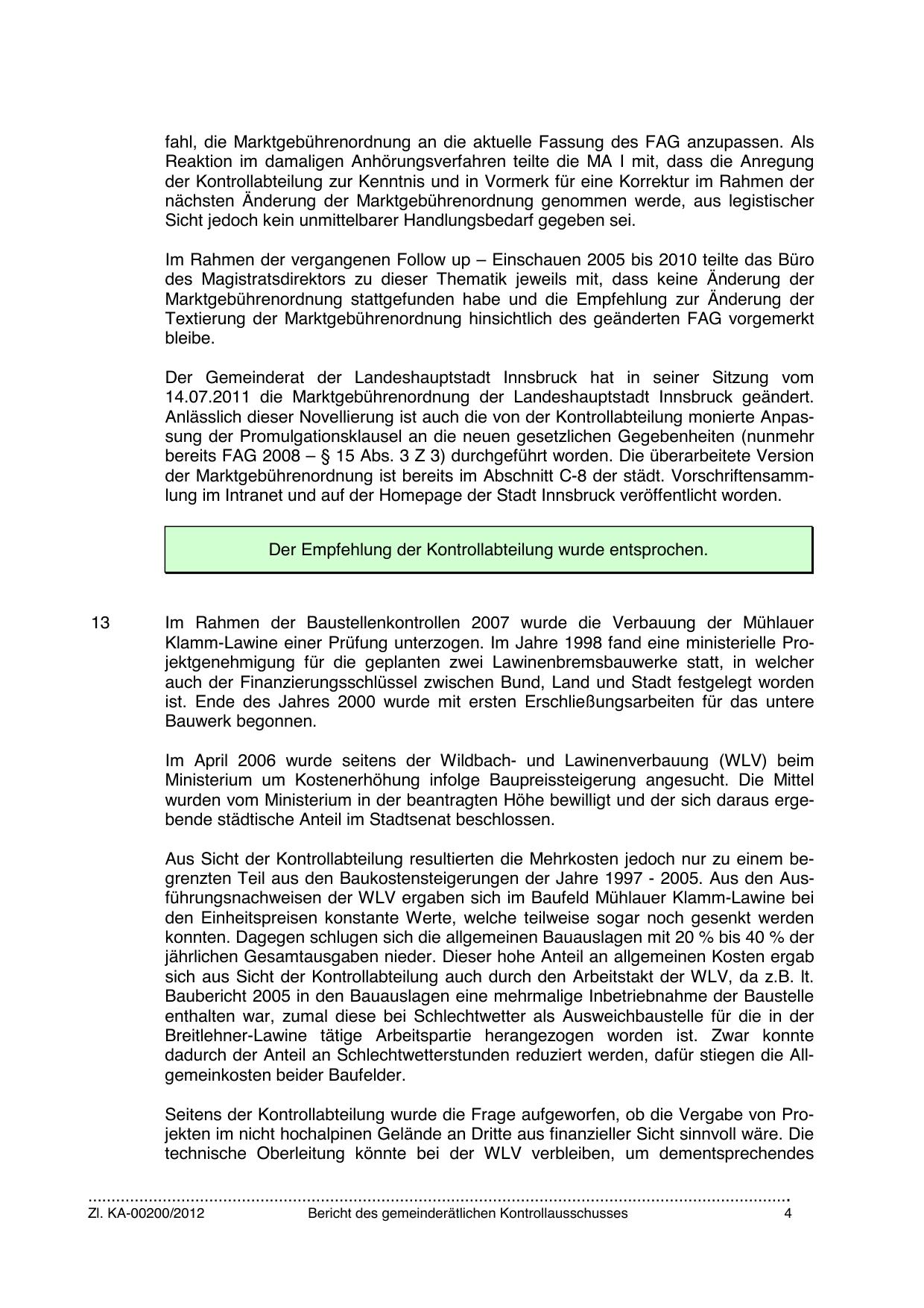 Aus Sicht der Kontrollabteilung resultierten die Mehrkosten jedoch nur zu einem begrenzten Teil aus den Baukostensteigerungen der Jahre 1997 - 2005. Aus den Ausführungsnachweisen der WLV ergaben sich im Baufeld Mühlauer Klamm-Lawine bei