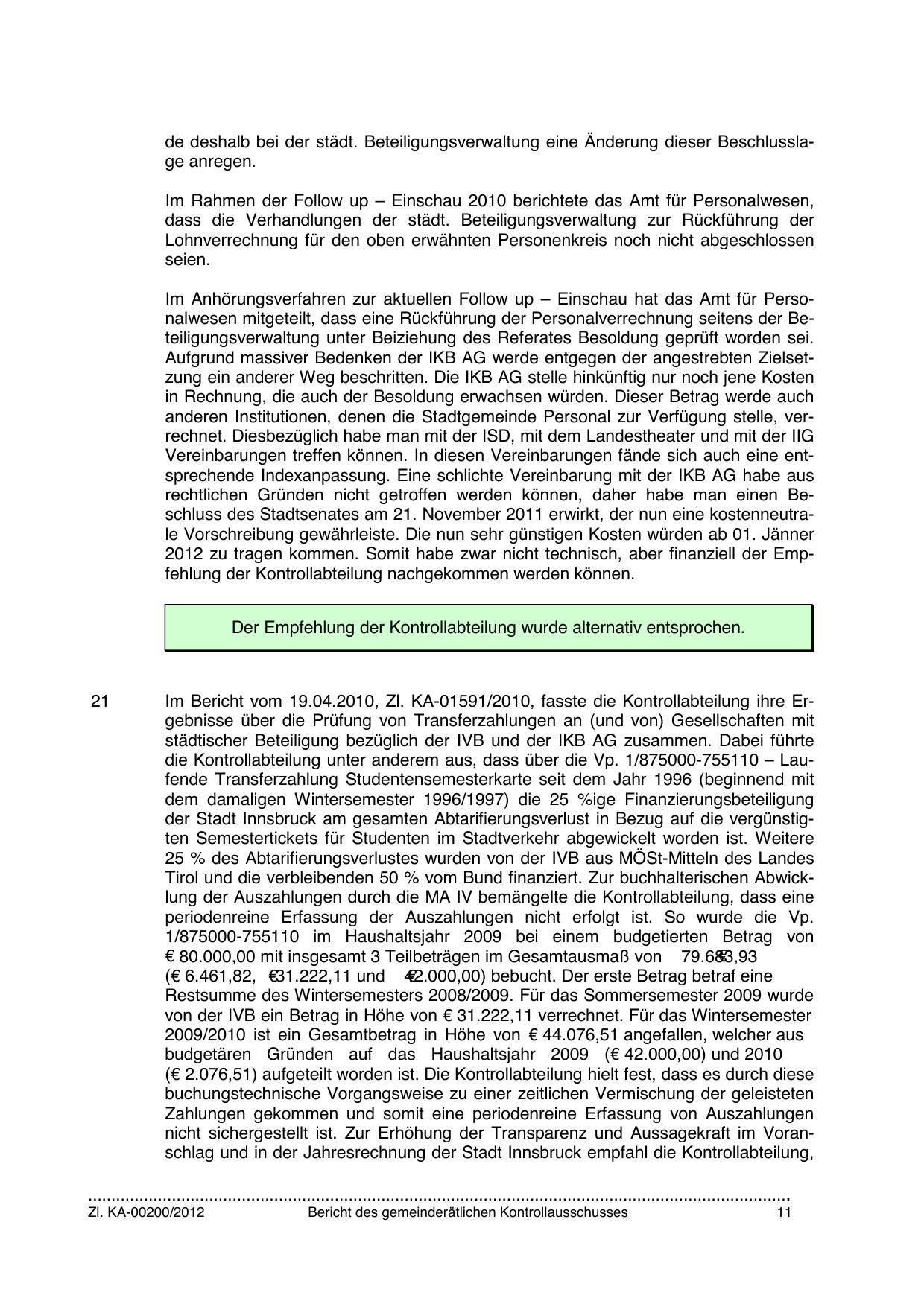 nicht sichergestellt ist. Zur Erhöhung der Transparenz und Aussagekraft im Voranschlag und in der Jahresrechnung der Stadt Innsbruck empfahl die Kontrollabteilung,