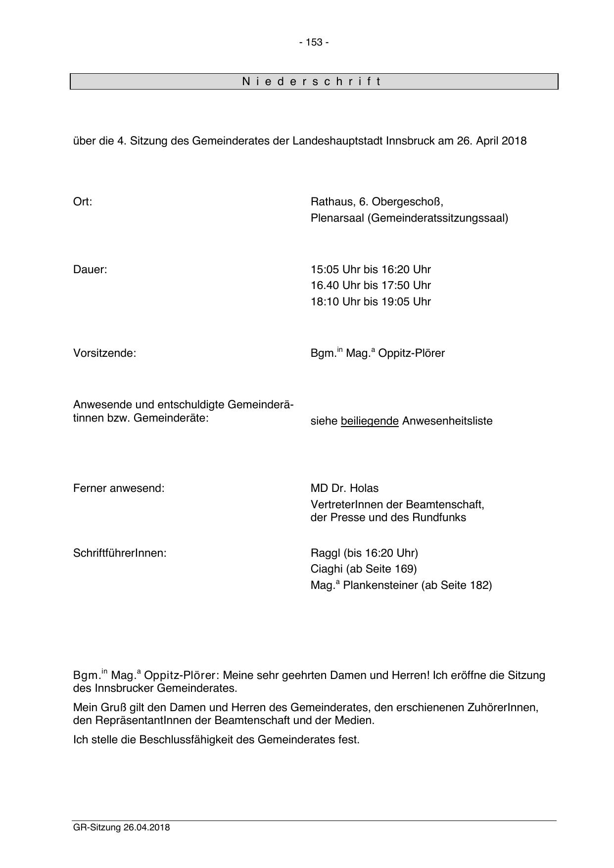 über die 4. Sitzung des Gemeinderates der Landeshauptstadt Innsbruck am 26. April 2018