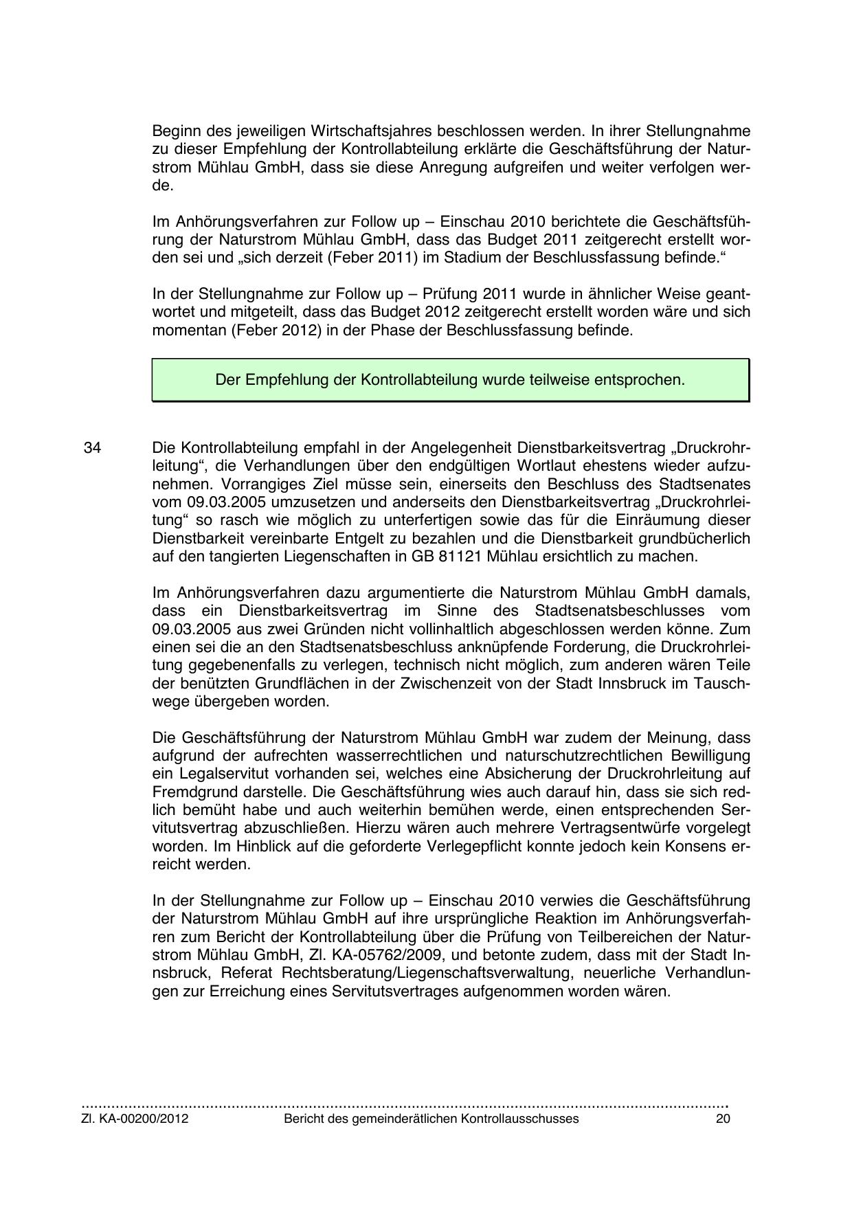 der Naturstrom Mühlau GmbH auf ihre ursprüngliche Reaktion im Anhörungsverfahren zum Bericht der Kontrollabteilung über die Prüfung von Teilbereichen der Naturstrom Mühlau GmbH, Zl. KA-05762/2009, und betonte zudem, dass mit der Stadt Innsbruck, Referat Rechtsberatung/Liegenschaftsverwaltung, neuerliche Verhandlungen zur Erreichung eines Servitutsvertrages aufgenommen worden wären.