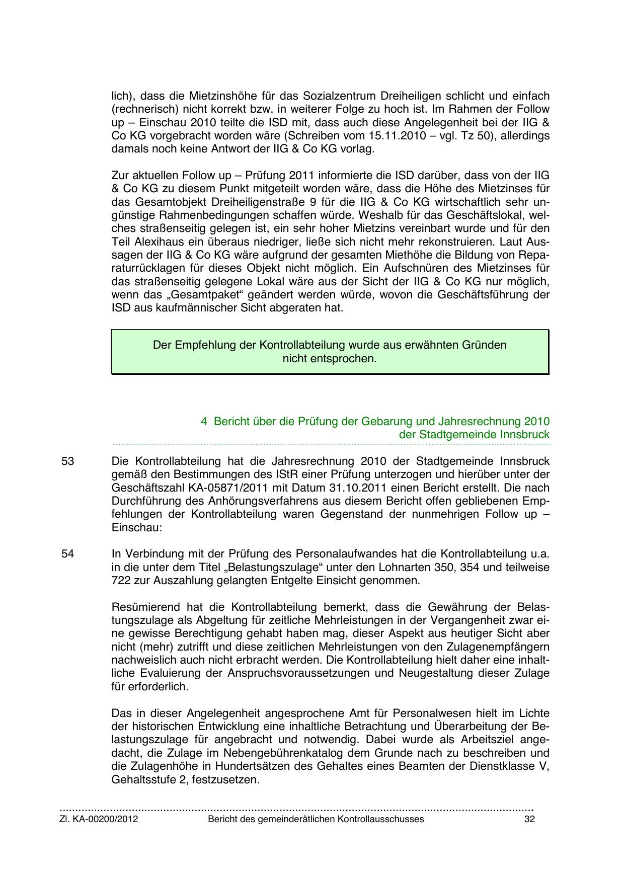 Die Kontrollabteilung hat die Jahresrechnung 2010 der Stadtgemeinde Innsbruck