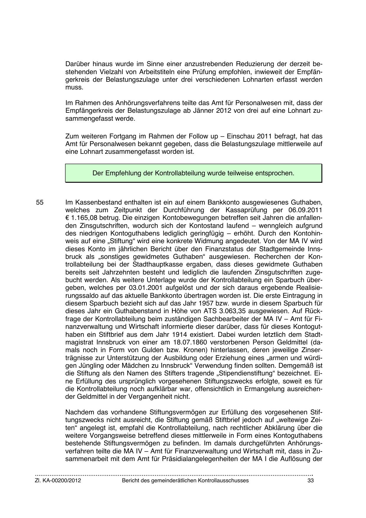 dieses Jahr ein Guthabenstand in Höhe von ATS 3.063,35 ausgewiesen. Auf Rückfrage der Kontrollabteilung beim zuständigen Sachbearbeiter der MA IV – Amt für Finanzverwaltung und Wirtschaft informierte dieser darüber, dass für dieses Kontoguthaben ein Stiftbrief aus dem Jahr 1914 existiert. Dabei wurden letztlich dem Stadtmagistrat Innsbruck von einer am 18.07.1860 verstorbenen Person Geldmittel (damals noch in Form von Gulden bzw. Kronen) hinterlassen, deren jeweilige Zinserträgnisse zur Unterstützung der Ausbildung oder Erziehung eines „armen und würdigen Jüngling oder Mädchen zu Innsbruck“ Verwendung finden sollten. Demgemäß ist