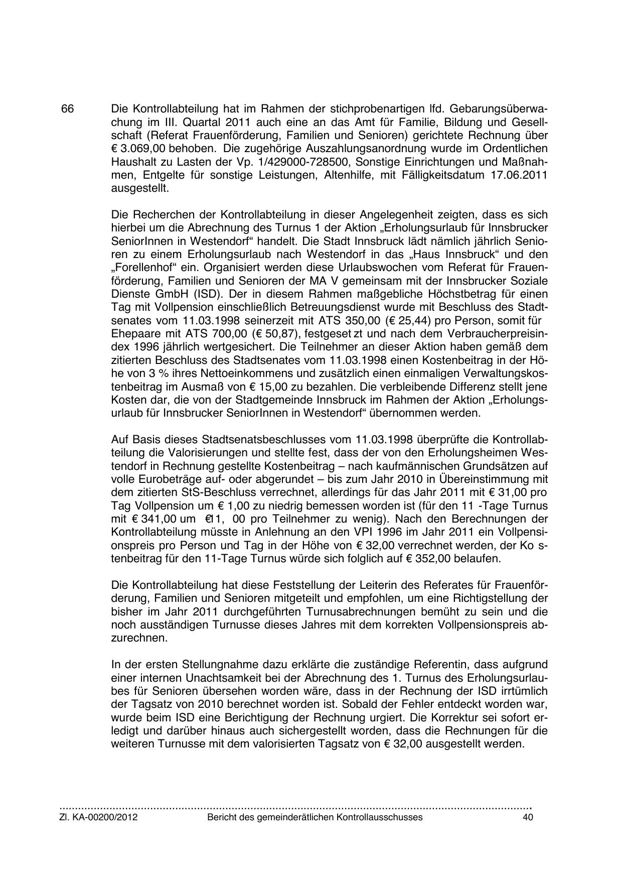 Auf Basis dieses Stadtsenatsbeschlusses vom 11.03.1998 überprüfte die Kontrollabteilung die Valorisierungen und stellte fest, dass der von den Erholungsheimen Westendorf in Rechnung gestellte Kostenbeitrag – nach kaufmännischen Grundsätzen auf