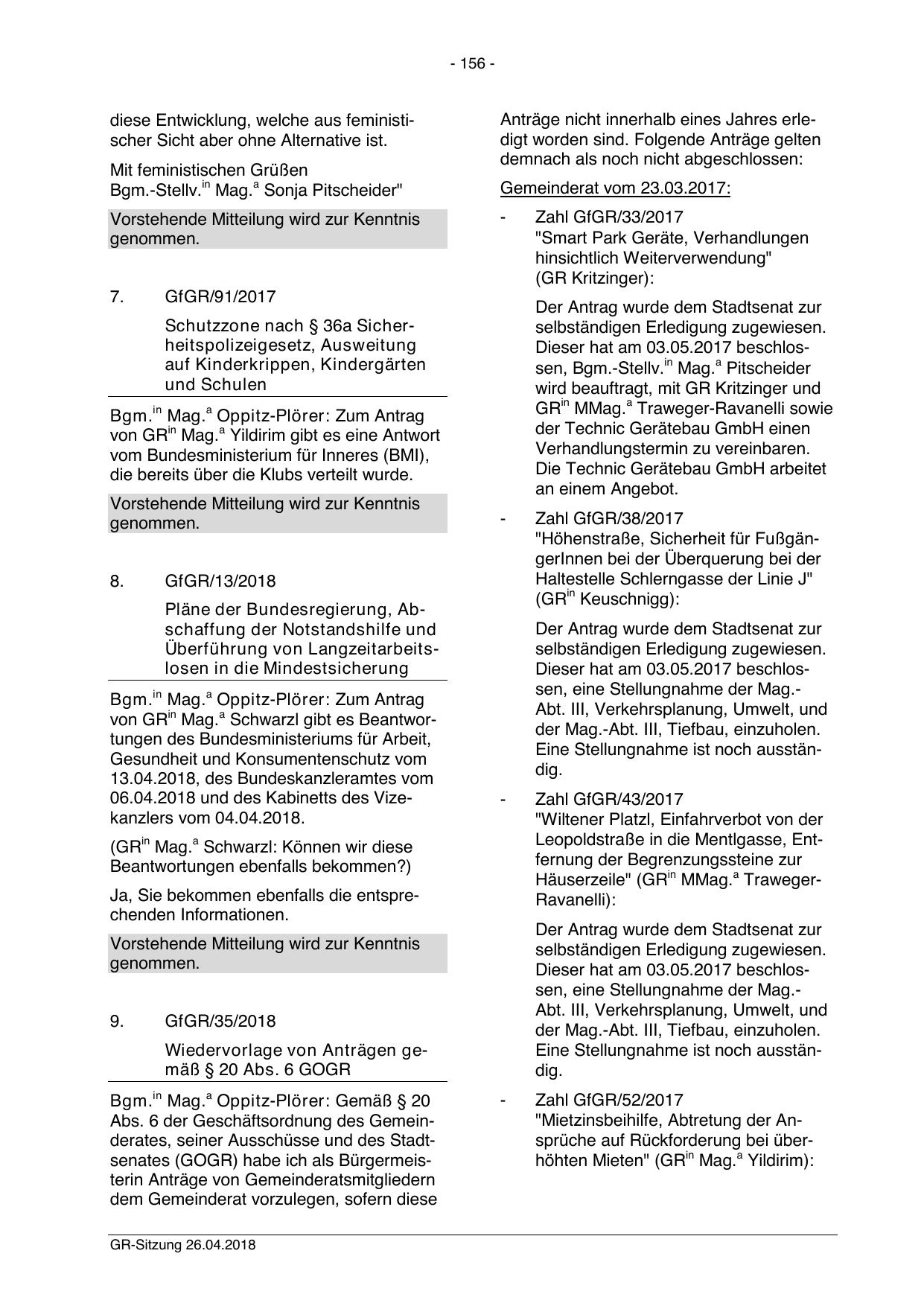 Abs. 6 der Geschäftsordnung des Gemeinderates, seiner Ausschüsse und des Stadtsenates (GOGR) habe ich als Bürgermeisterin Anträge von Gemeinderatsmitgliedern