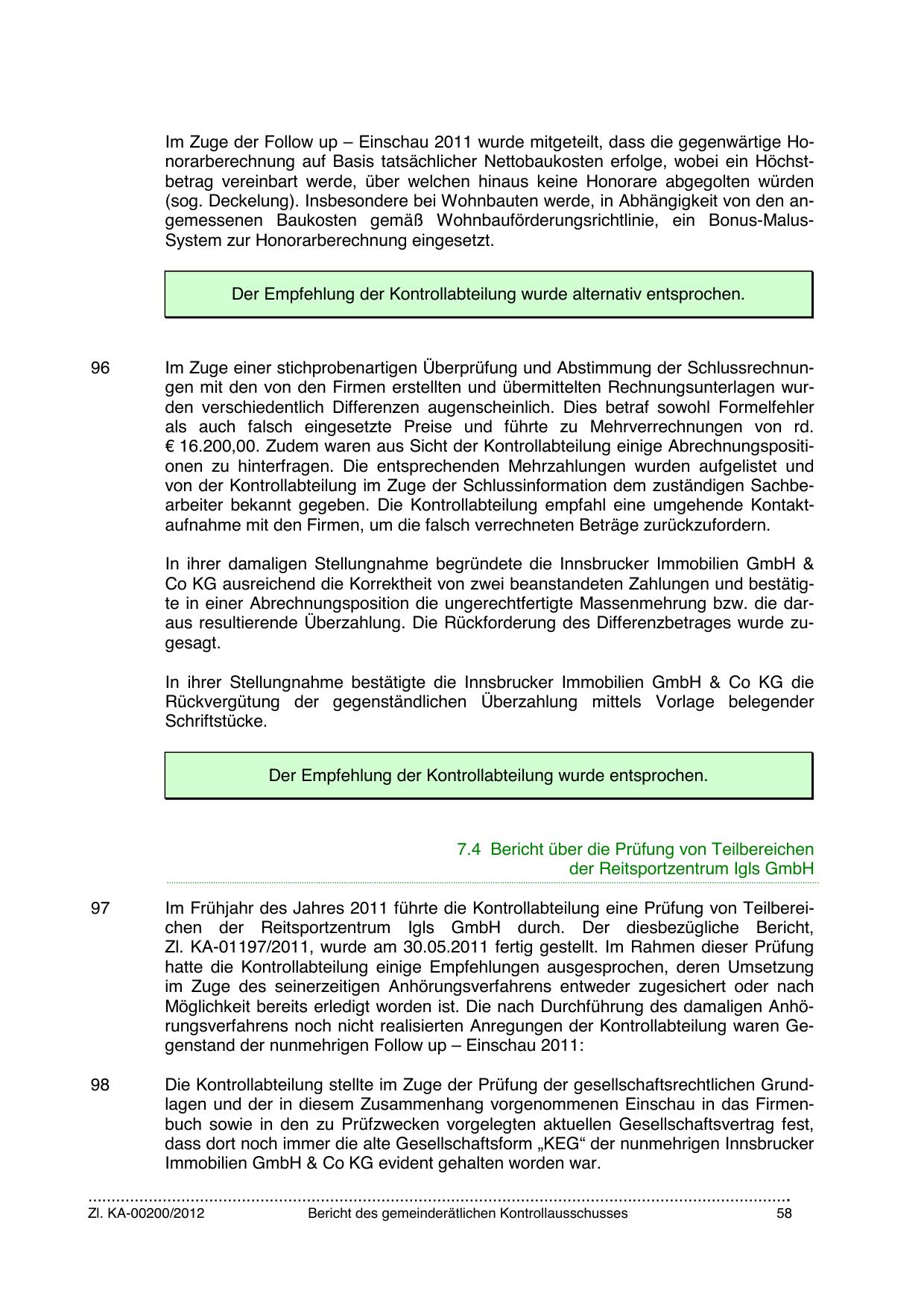 Im Frühjahr des Jahres 2011 führte die Kontrollabteilung eine Prüfung von Teilbereichen der Reitsportzentrum Igls GmbH durch. Der diesbezügliche Bericht,