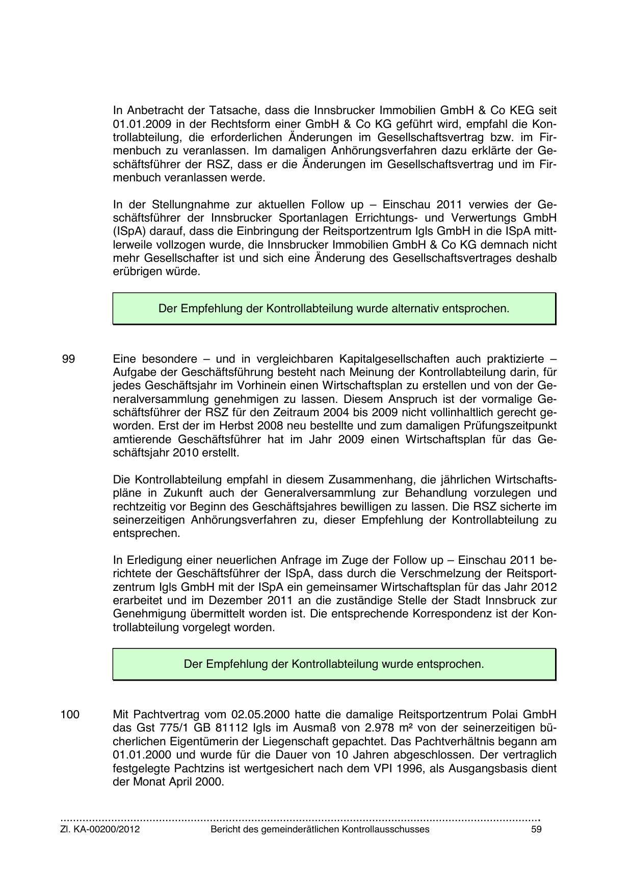 In Erledigung einer neuerlichen Anfrage im Zuge der Follow up – Einschau 2011 berichtete der Geschäftsführer der ISpA, dass durch die Verschmelzung der Reitsportzentrum Igls GmbH mit der ISpA ein gemeinsamer Wirtschaftsplan für das Jahr 2012