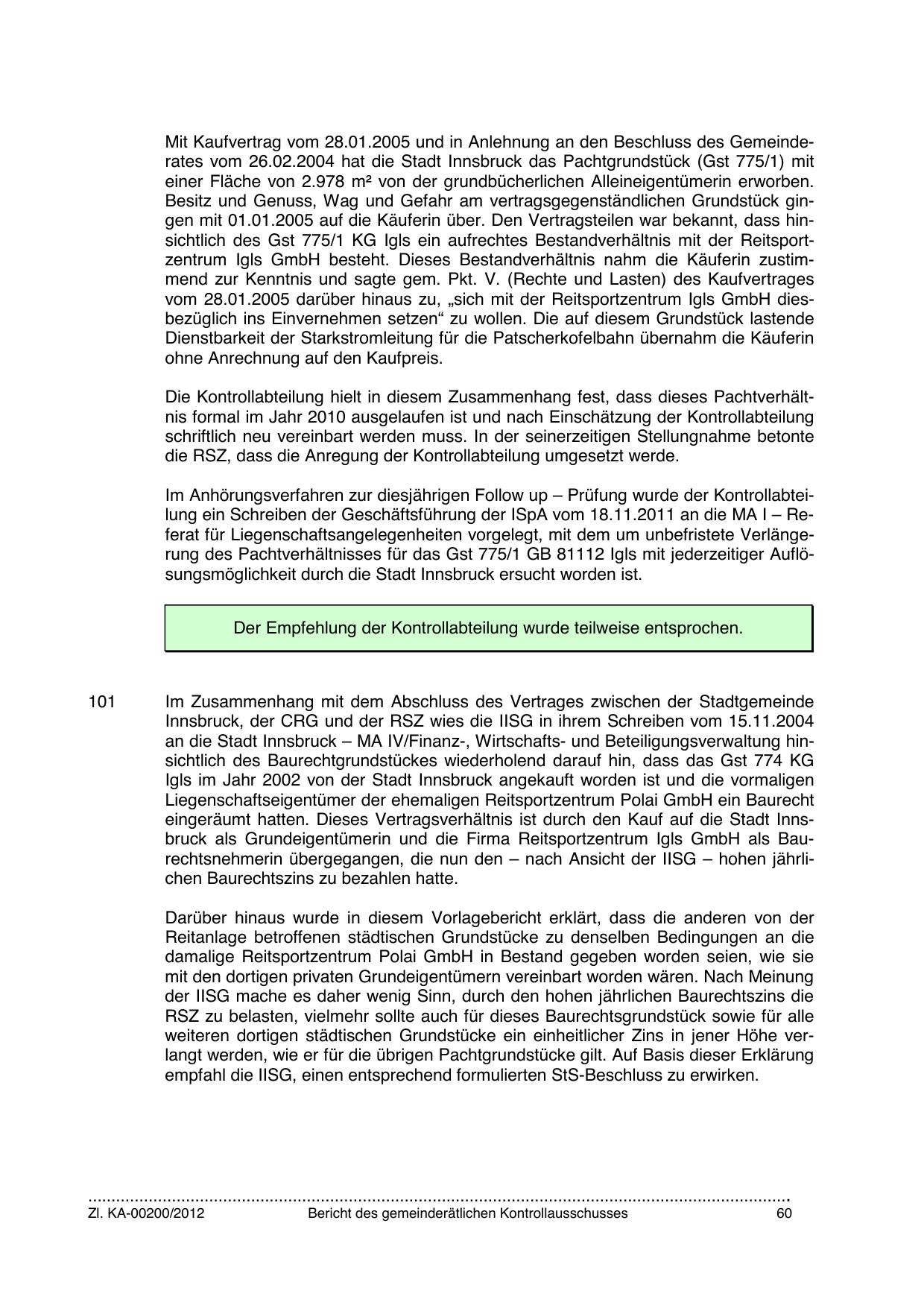 Im Anhörungsverfahren zur diesjährigen Follow up – Prüfung wurde der Kontrollabteilung ein Schreiben der Geschäftsführung der ISpA vom 18.11.2011 an die MA I – Referat für Liegenschaftsangelegenheiten vorgelegt, mit dem um unbefristete Verlängerung des Pachtverhältnisses für das Gst 775/1 GB 81112 Igls mit jederzeitiger Auflösungsmöglichkeit durch die Stadt Innsbruck ersucht worden ist.