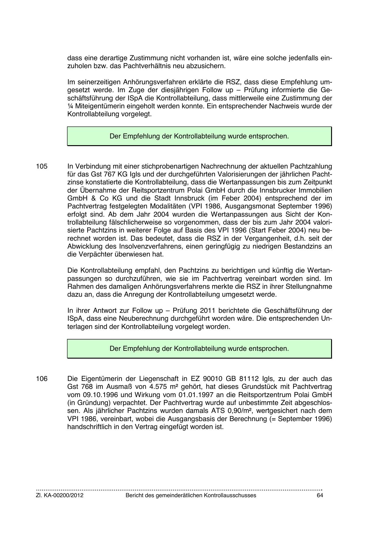 für das Gst 767 KG Igls und der durchgeführten Valorisierungen der jährlichen Pachtzinse konstatierte die Kontrollabteilung, dass die Wertanpassungen bis zum Zeitpunkt