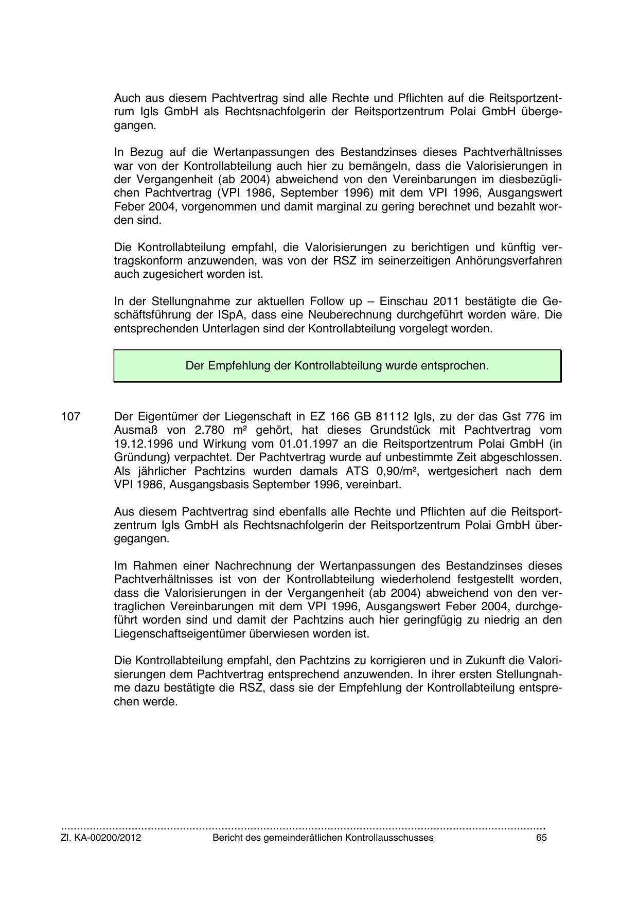 Die Kontrollabteilung empfahl, die Valorisierungen zu berichtigen und künftig vertragskonform anzuwenden, was von der RSZ im seinerzeitigen Anhörungsverfahren