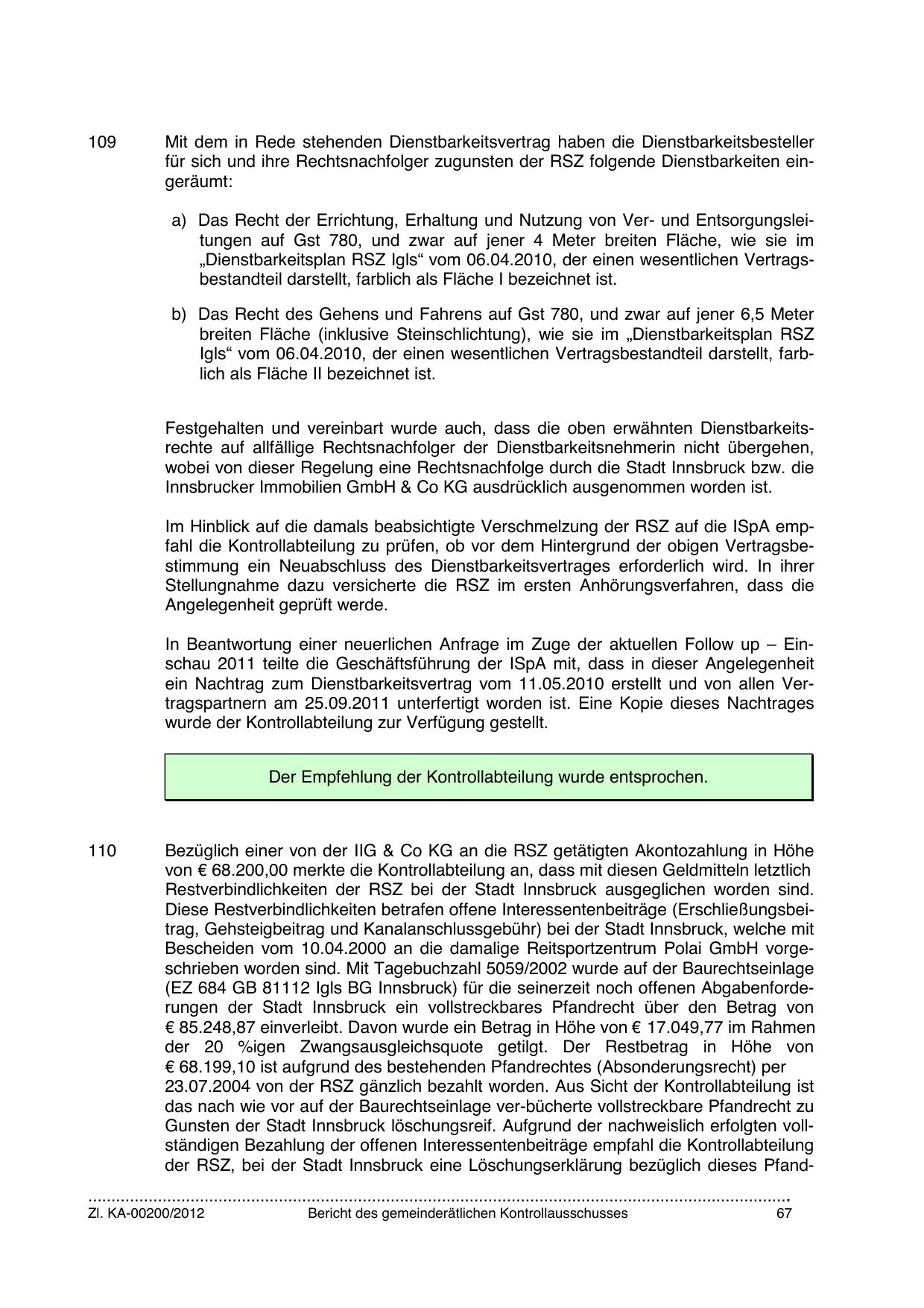 Im Hinblick auf die damals beabsichtigte Verschmelzung der RSZ auf die ISpA empfahl die Kontrollabteilung zu prüfen, ob vor dem Hintergrund der obigen Vertragsbestimmung ein Neuabschluss des Dienstbarkeitsvertrages erforderlich wird. In ihrer