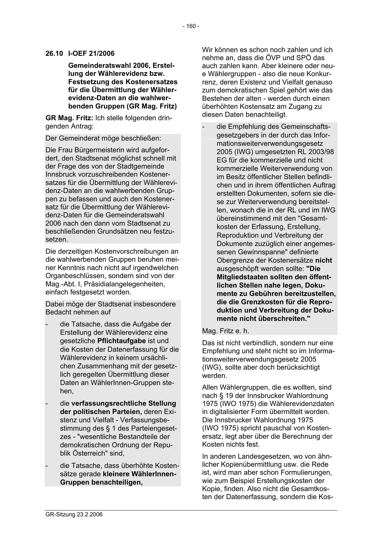 für die Übermittlung der Wählerevidenz-Daten an die wahlwerbenden Gruppen (GR Mag. Fritz)