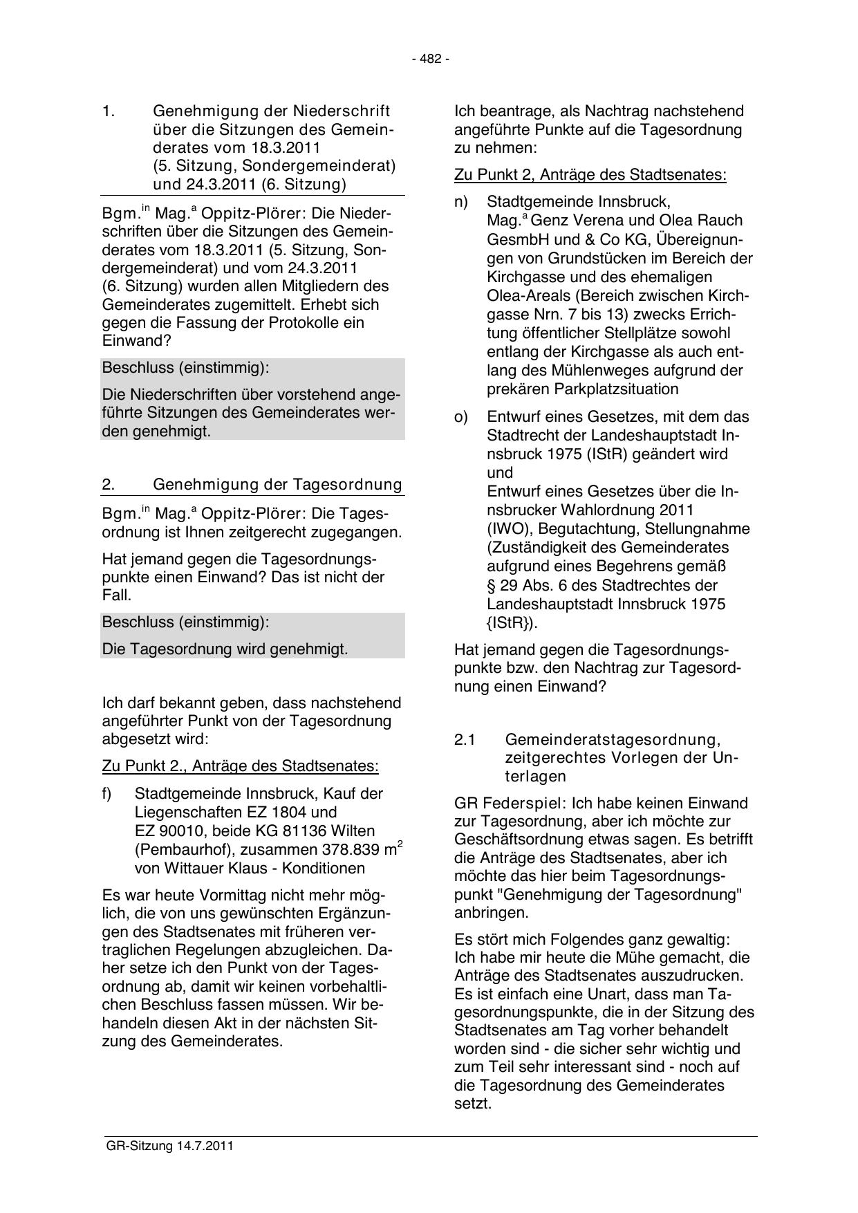 Bgm.in Mag.a Oppitz-Plörer: Die Niederschriften über die Sitzungen des Gemeinderates vom 18.3.2011 (5. Sitzung, Sondergemeinderat) und vom 24.3.2011