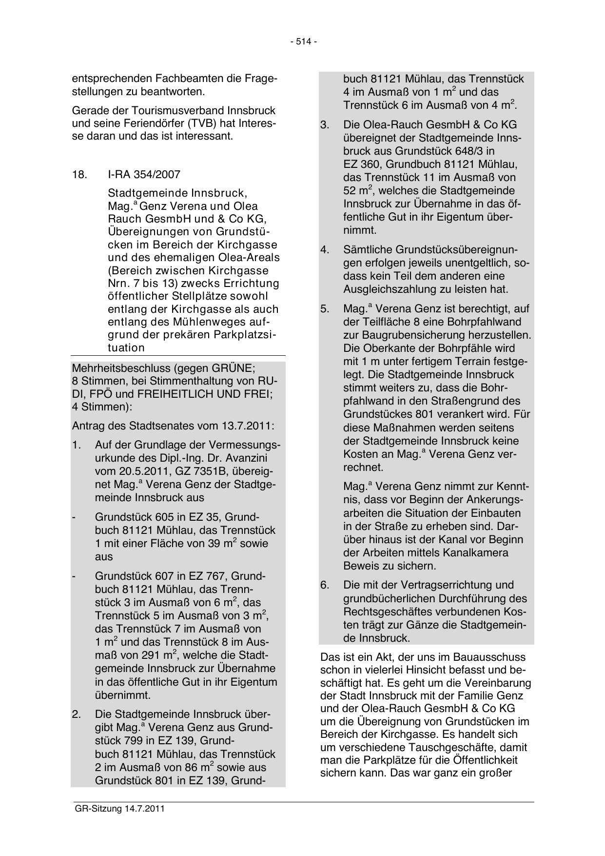 vom 20.5.2011, GZ 7351B, übereignet Mag.a Verena Genz der Stadtgemeinde Innsbruck aus