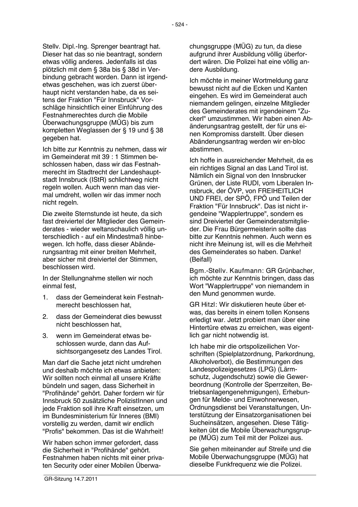 im Gemeinderat mit 39 : 1 Stimmen beschlossen haben, dass wir das Festnahmerecht im Stadtrecht der Landeshauptstadt Innsbruck (IStR) schlichtweg nicht