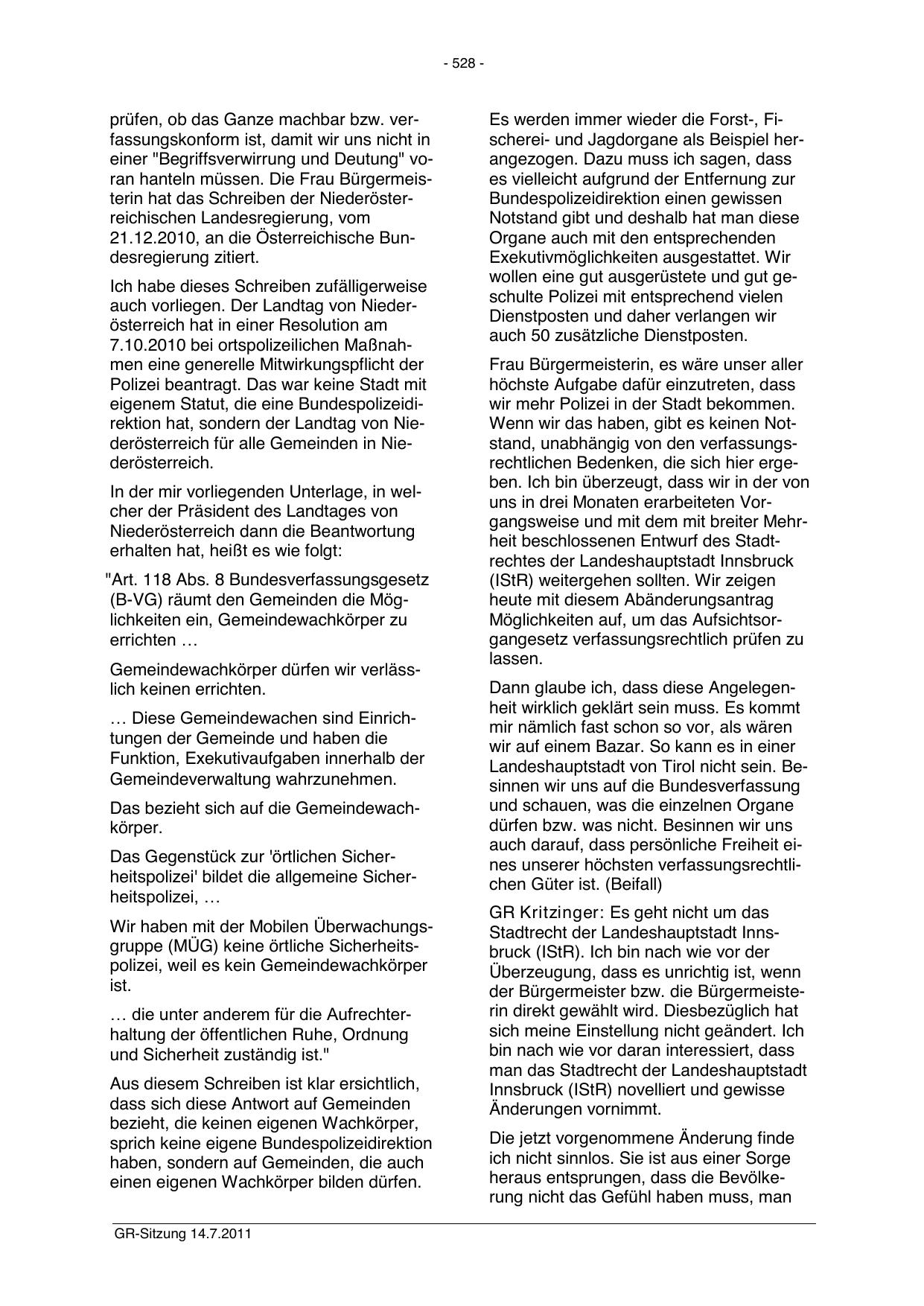 uns in drei Monaten erarbeiteten Vorgangsweise und mit dem mit breiter Mehrheit beschlossenen Entwurf des Stadtrechtes der Landeshauptstadt Innsbruck