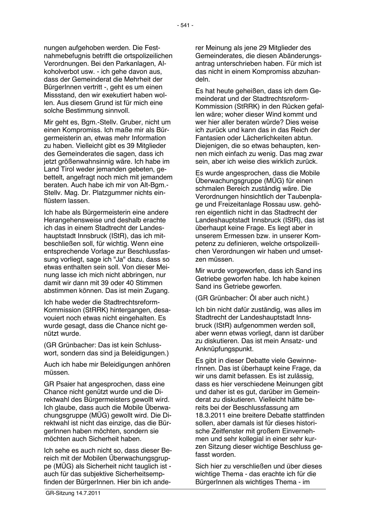 Ich sehe es auch nicht so, dass dieser Bereich mit der Mobilen Überwachungsgruppe (MÜG) als Sicherheit nicht tauglich ist auch für das subjektive Sicherheitsempfinden der BürgerInnen. Hier bin ich andeGR-Sitzung 14.7.2011