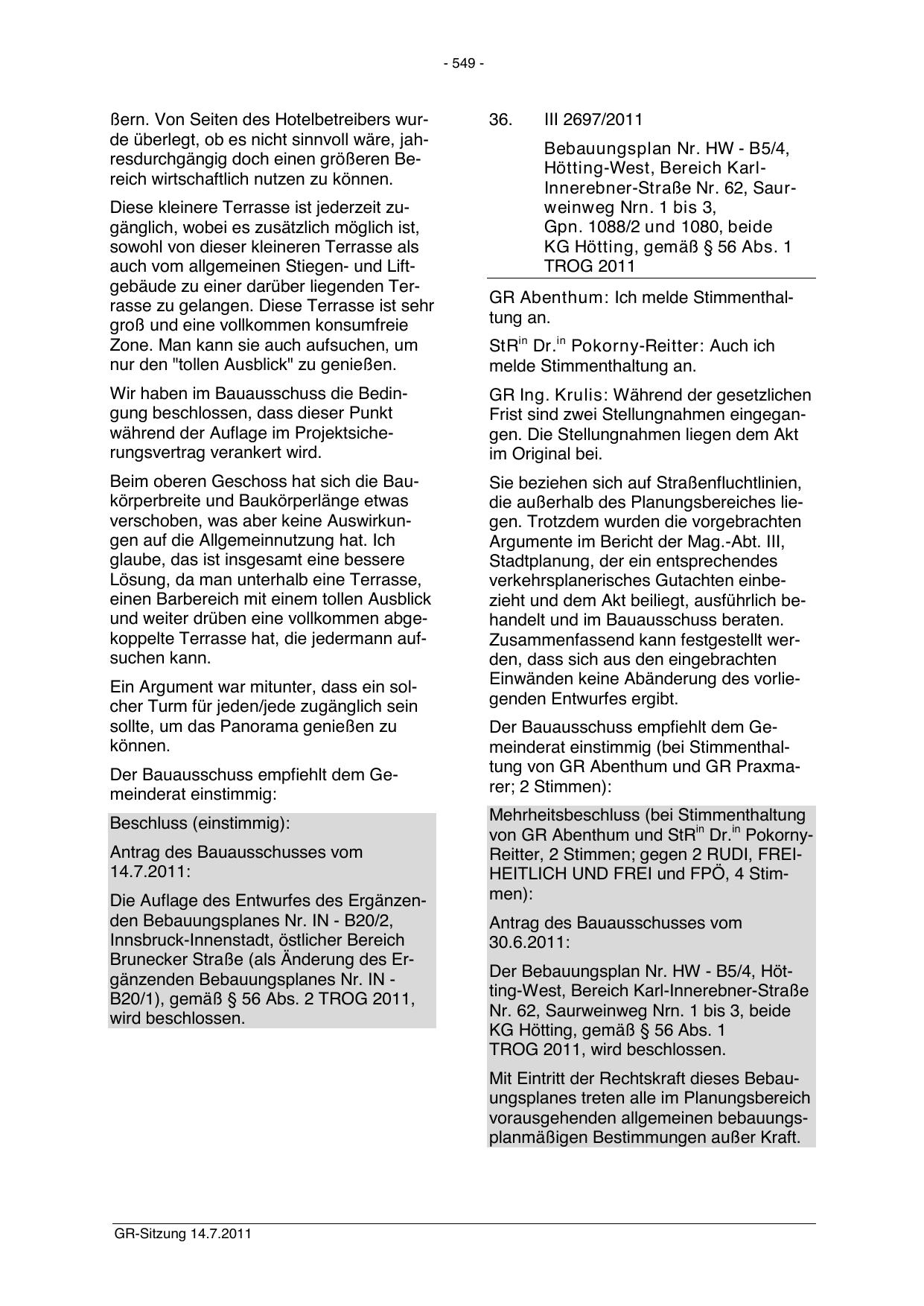 Brunecker Straße (als Änderung des Ergänzenden Bebauungsplanes Nr. IN B20/1), gemäß § 56 Abs. 2 TROG 2011,