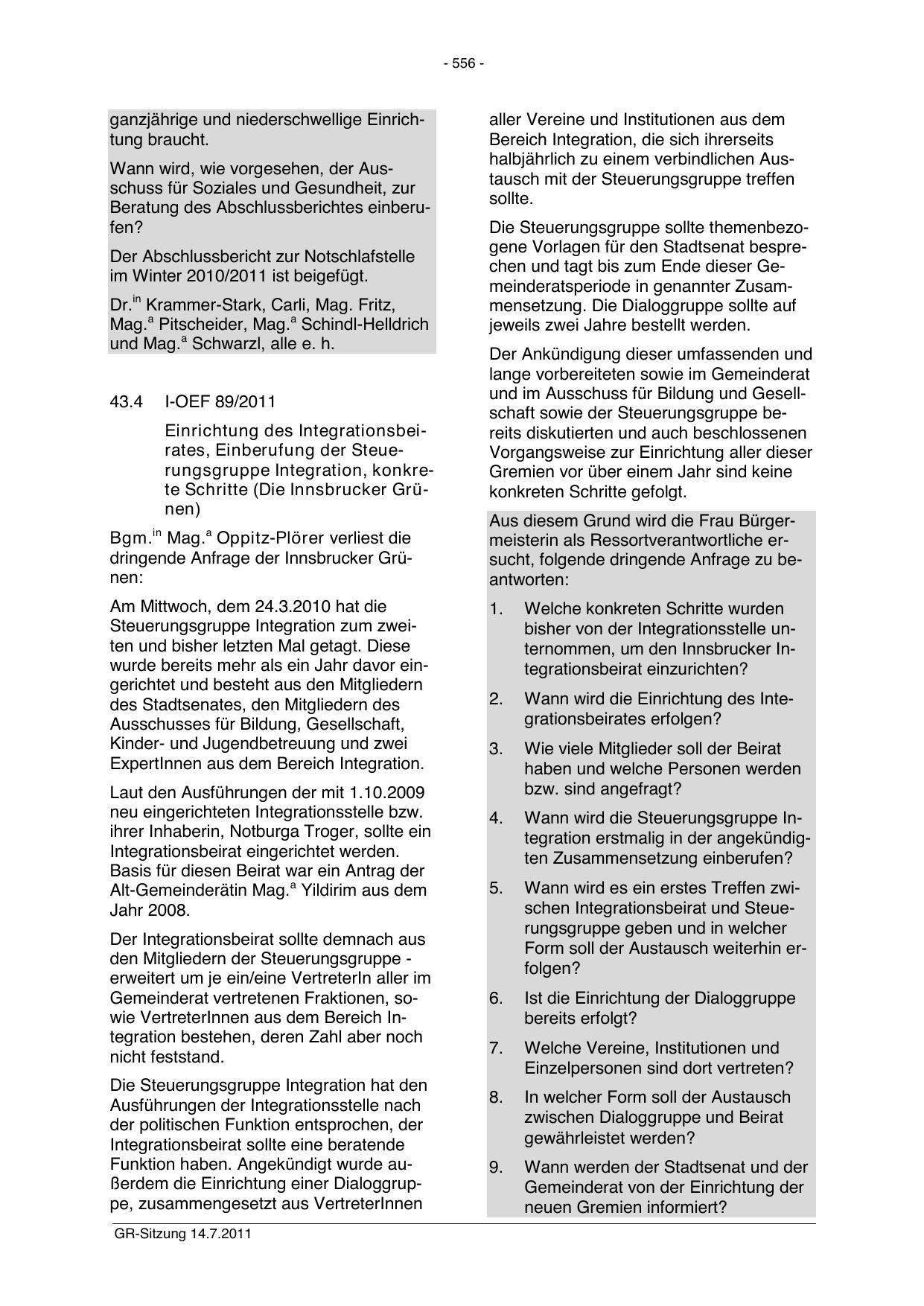 Einrichtung des Integrationsbeirates, Einberufung der Steuerungsgruppe Integration, konkrete Schritte (Die Innsbrucker Grünen)