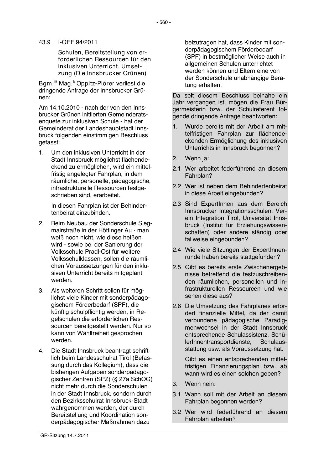 Am 14.10.2010 - nach der von den Innsbrucker Grünen initiierten Gemeinderatsenquete zur inklusiven Schule - hat der