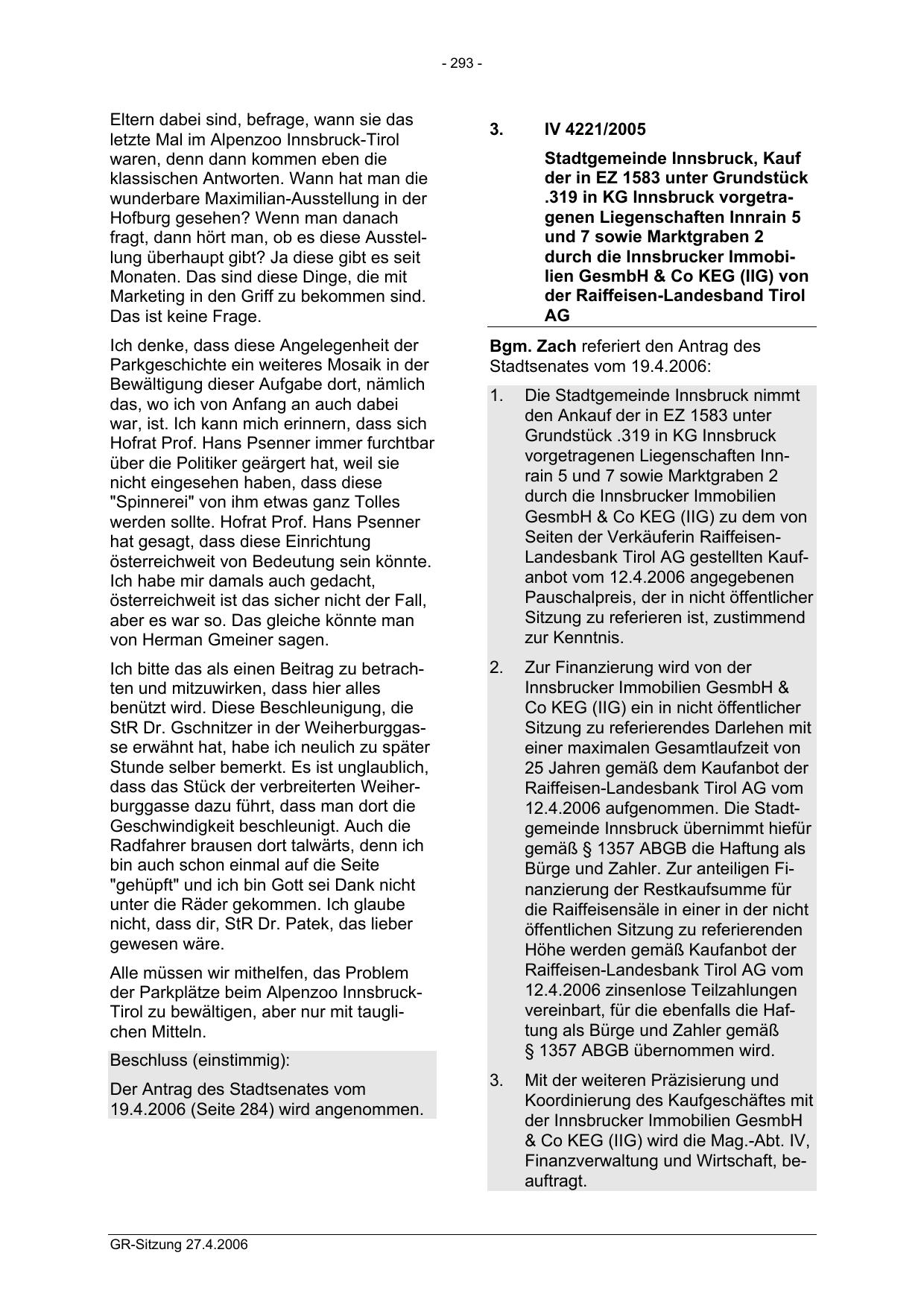 12.4.2006 aufgenommen. Die Stadtgemeinde Innsbruck übernimmt hiefür