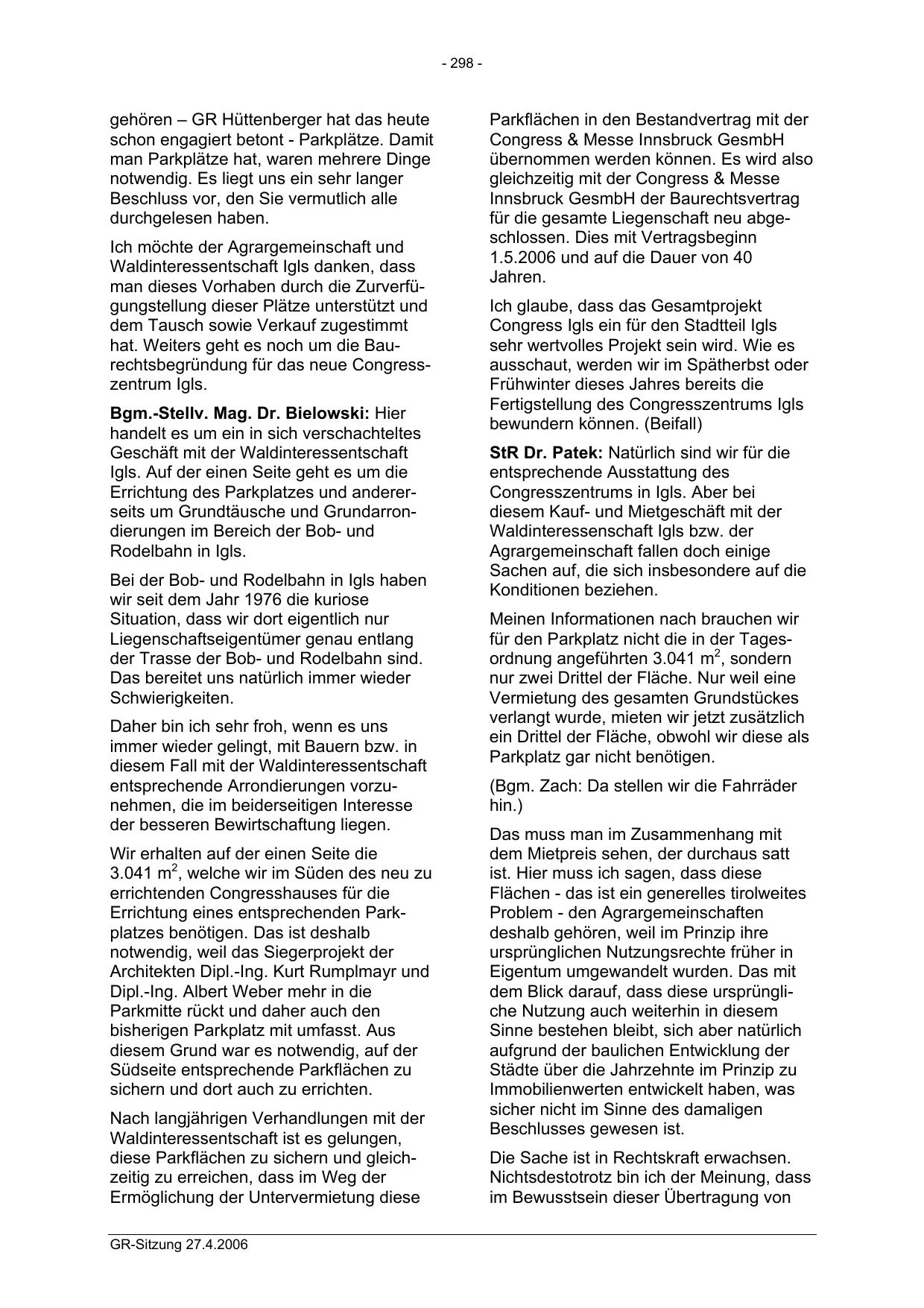 hat. Weiters geht es noch um die Baurechtsbegründung für das neue Congresszentrum Igls.