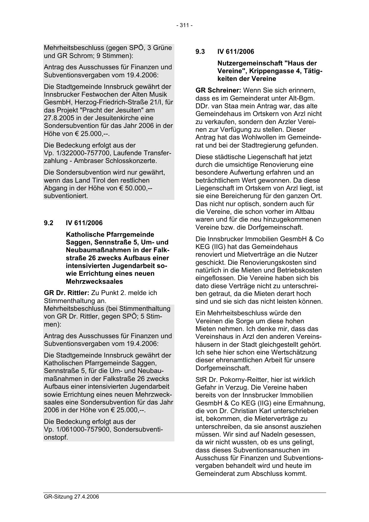 Mehrheitsbeschluss (gegen SPÖ, 3 Grüne