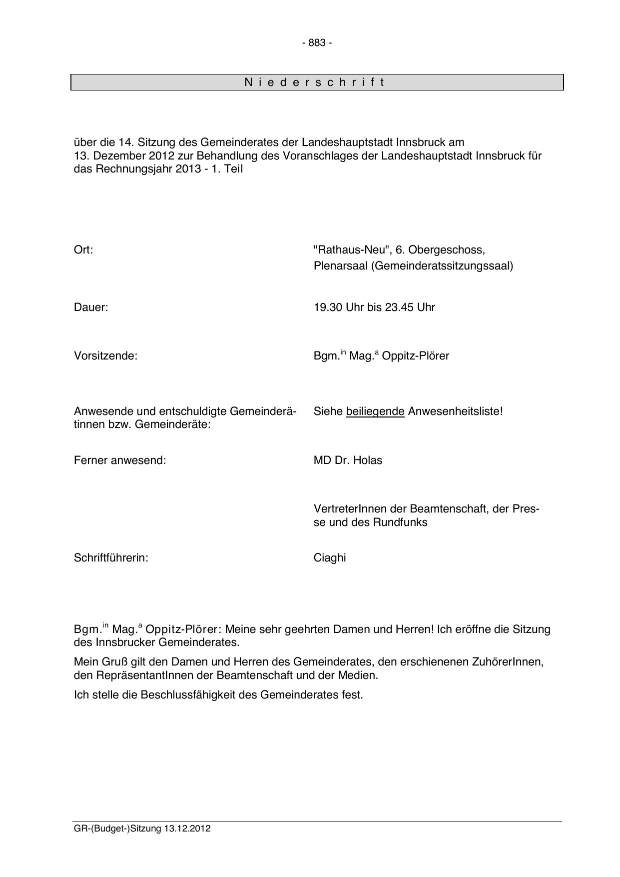 13. Dezember 2012 zur Behandlung des Voranschlages der Landeshauptstadt Innsbruck für