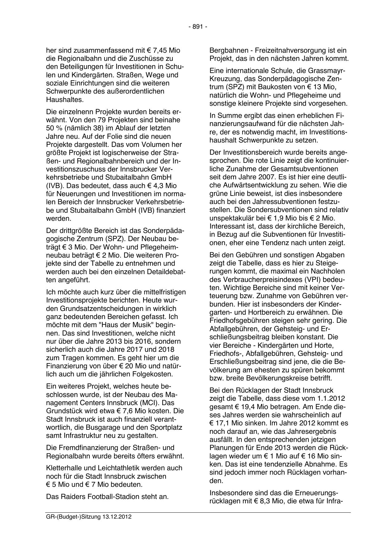 größte Projekt ist logischerweise der Straßen- und Regionalbahnbereich und der Investitionszuschuss der Innsbrucker Verkehrsbetriebe und Stubaitalbahn GmbH