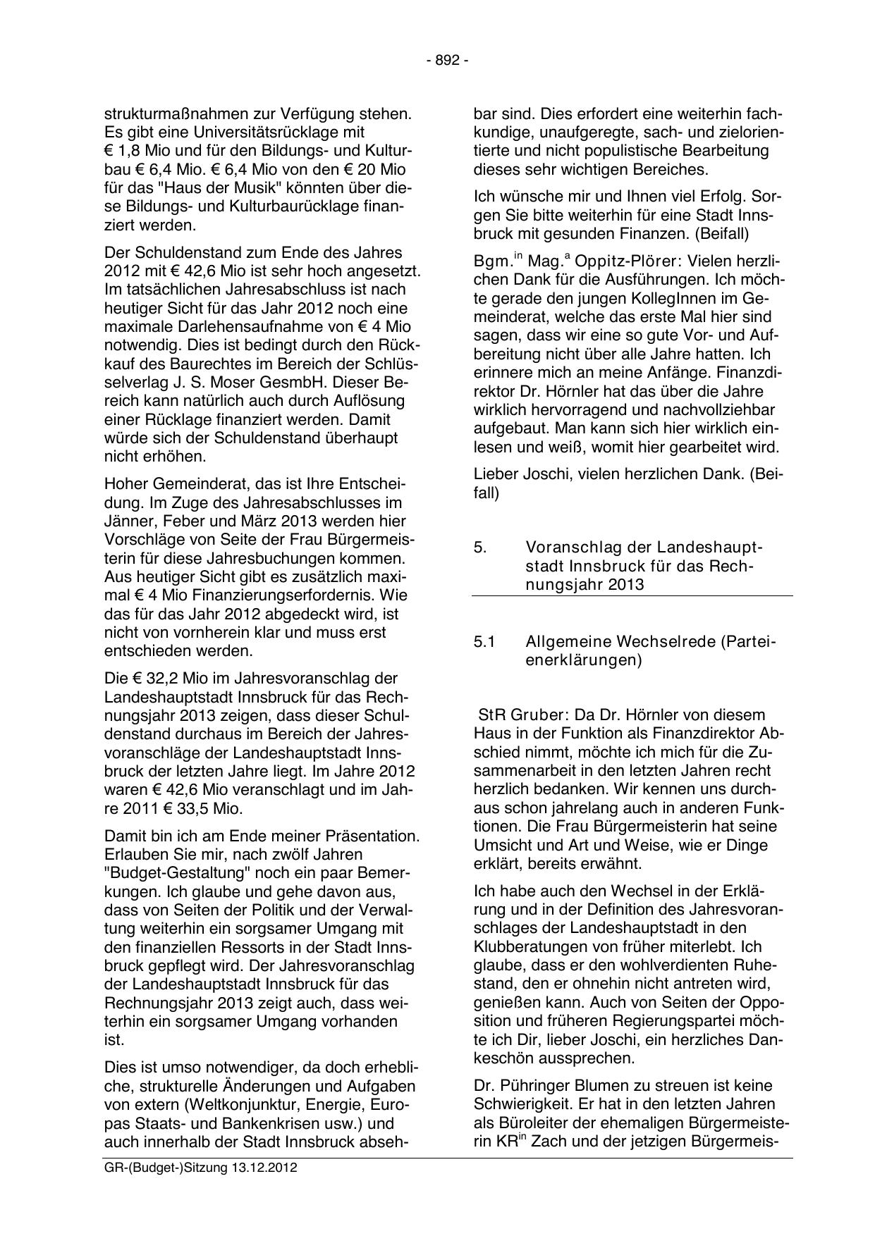 auch innerhalb der Stadt Innsbruck absehGR-(Budget-)Sitzung 13.12.2012