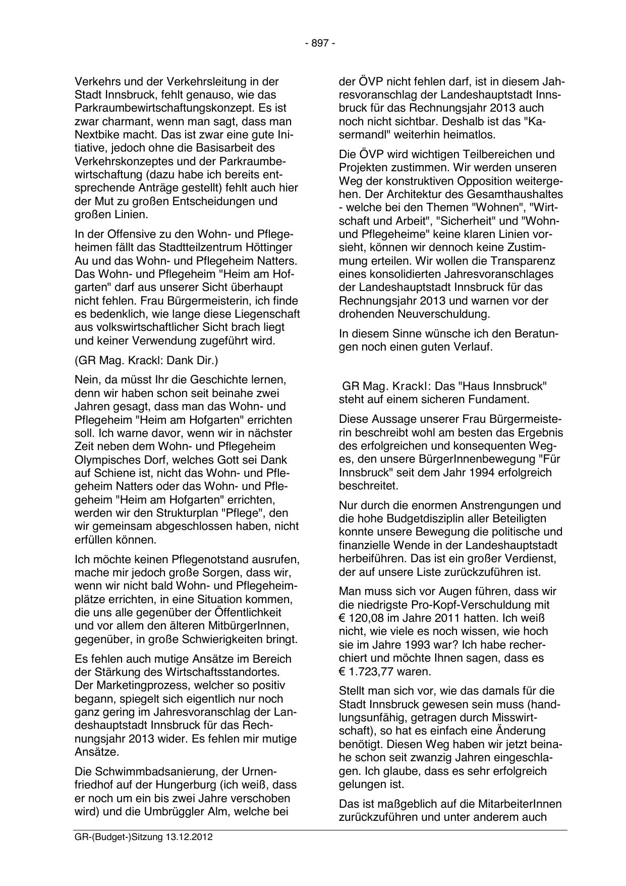 ganz gering im Jahresvoranschlag der Landeshauptstadt Innsbruck für das Rechnungsjahr 2013 wider. Es fehlen mir mutige