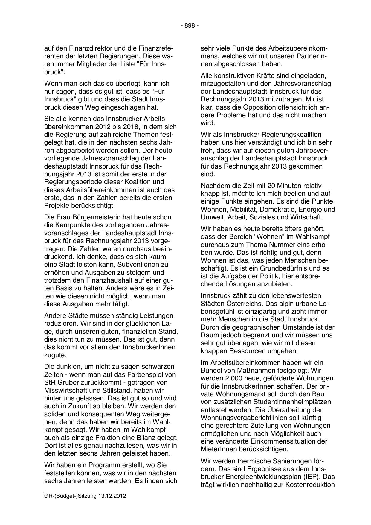 die Kernpunkte des vorliegenden Jahresvoranschlages der Landeshauptstadt Innsbruck für das Rechnungsjahr 2013 vorgetragen. Die Zahlen waren durchaus beeindruckend. Ich denke, dass es sich kaum