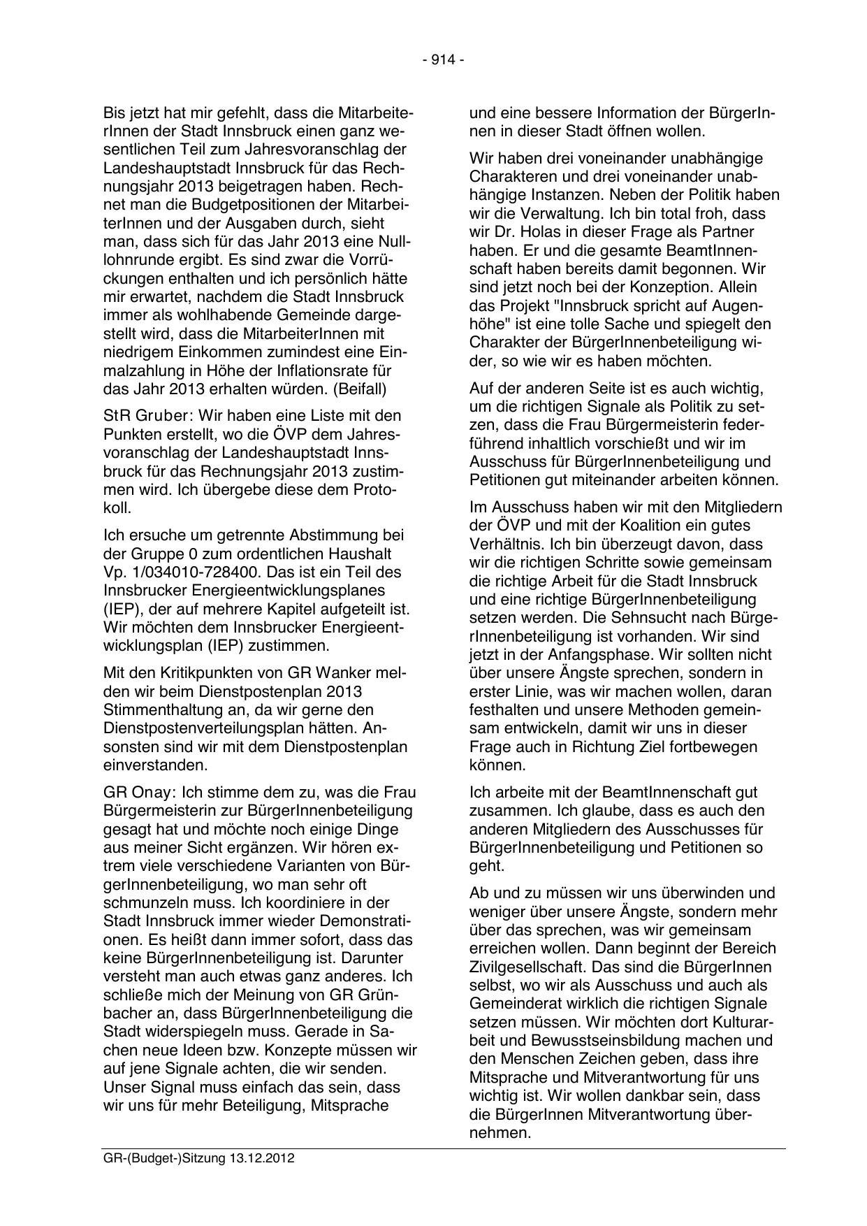 Punkten erstellt, wo die ÖVP dem Jahresvoranschlag der Landeshauptstadt Innsbruck für das Rechnungsjahr 2013 zustimmen wird. Ich übergebe diese dem Protokoll.