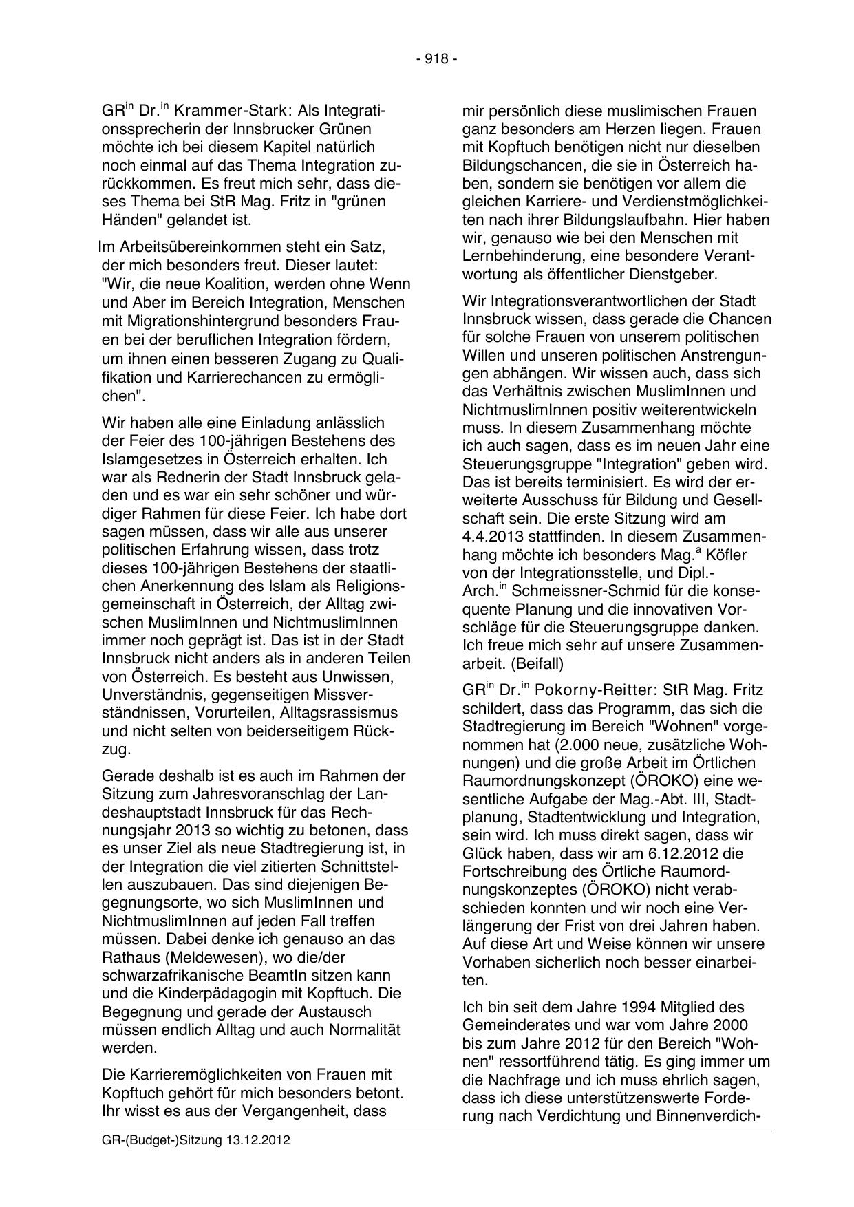 Sitzung zum Jahresvoranschlag der Landeshauptstadt Innsbruck für das Rechnungsjahr 2013 so wichtig zu betonen, dass