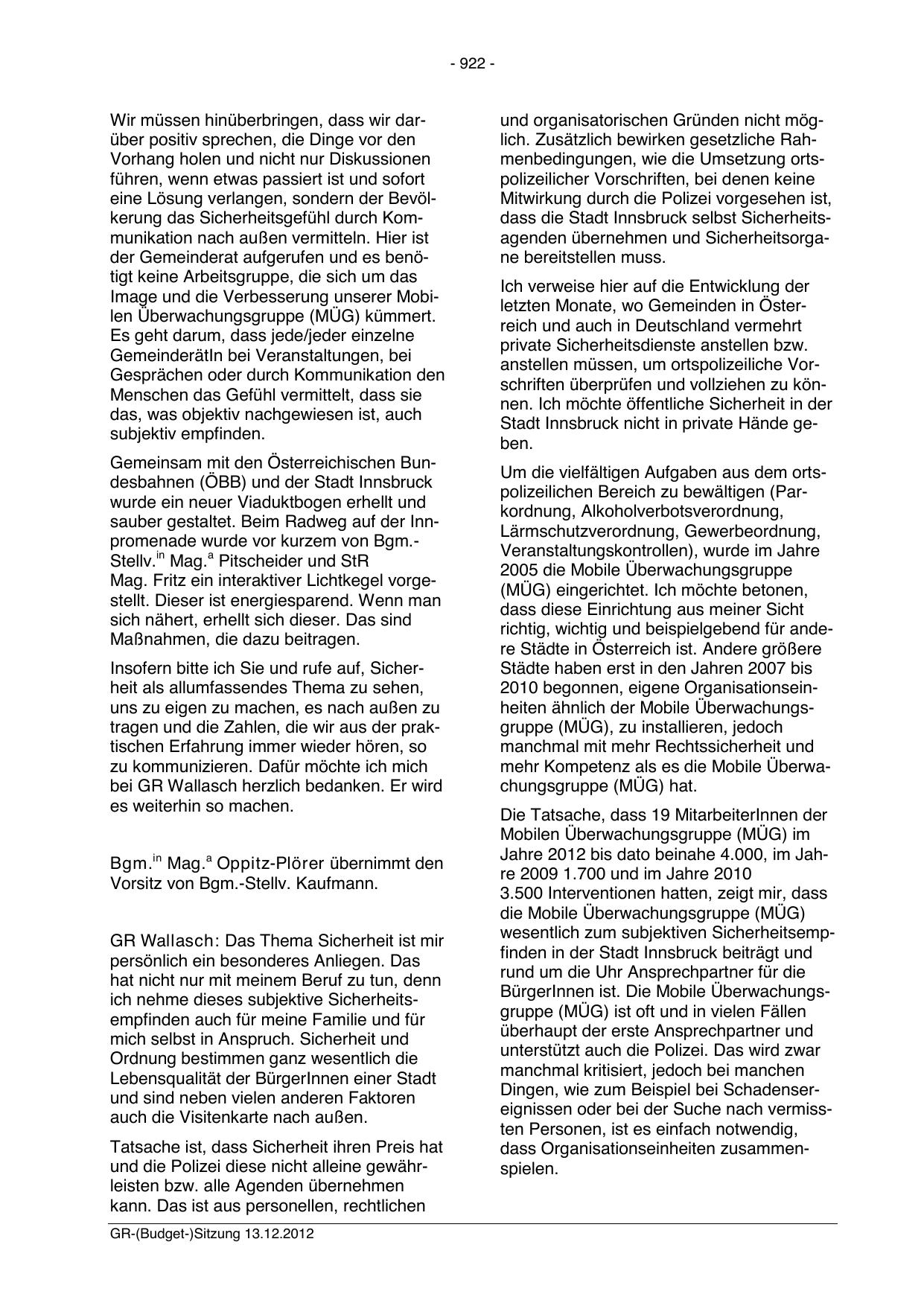 dass die Stadt Innsbruck selbst Sicherheitsagenden übernehmen und Sicherheitsorgane bereitstellen muss.