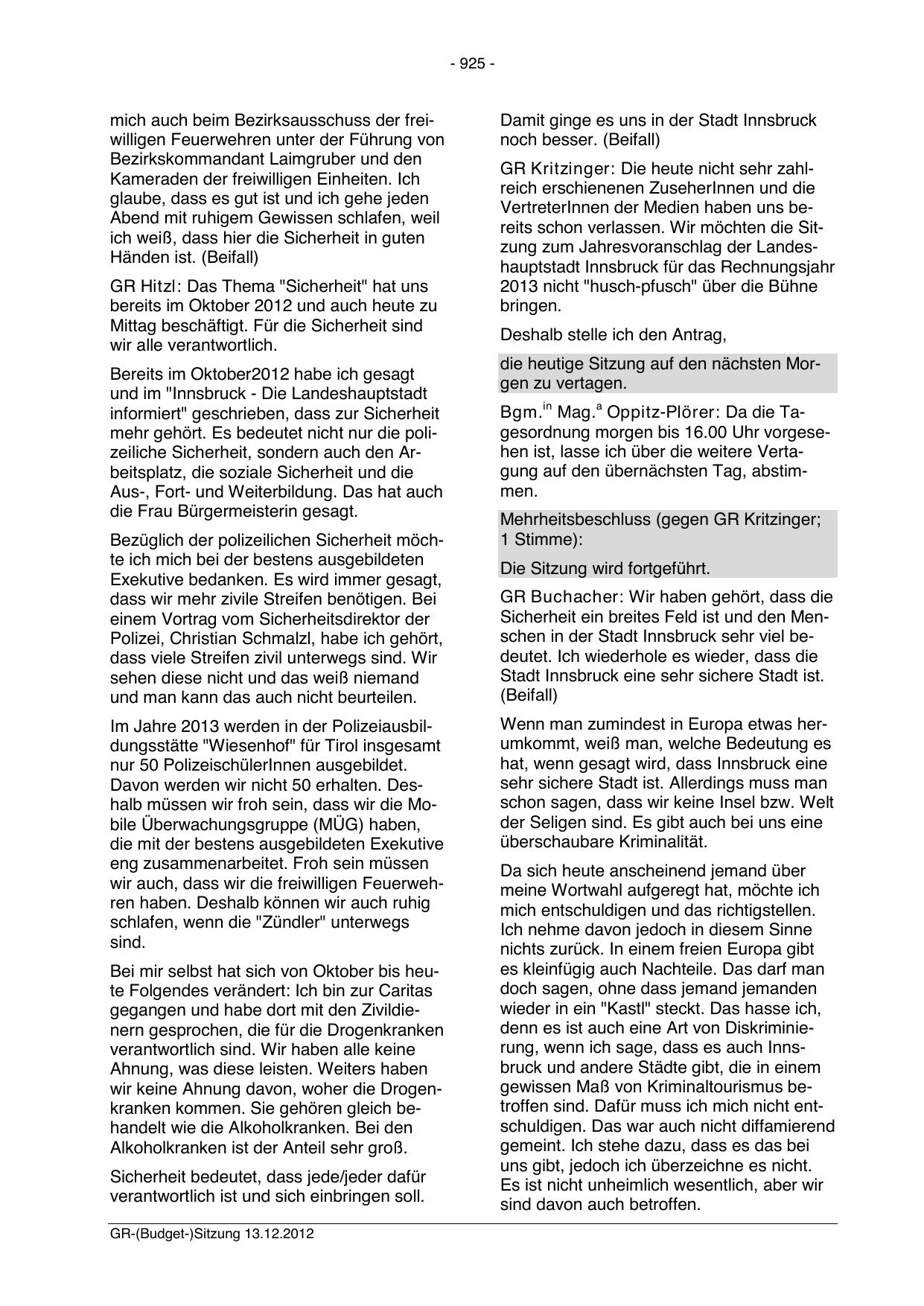 Sicherheit ein breites Feld ist und den Menschen in der Stadt Innsbruck sehr viel bedeutet. Ich wiederhole es wieder, dass die