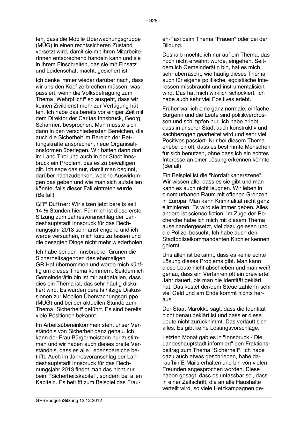 kann der Frau Bürgermeisterin nur zustimmen und wir haben auch dieses breite Verständnis, dass es alle Lebensbereiche betrifft. Auch im Jahresvoranschlag der Landeshauptstadt Innsbruck für das Rechnungsjahr 2013 findet man das nicht nur
