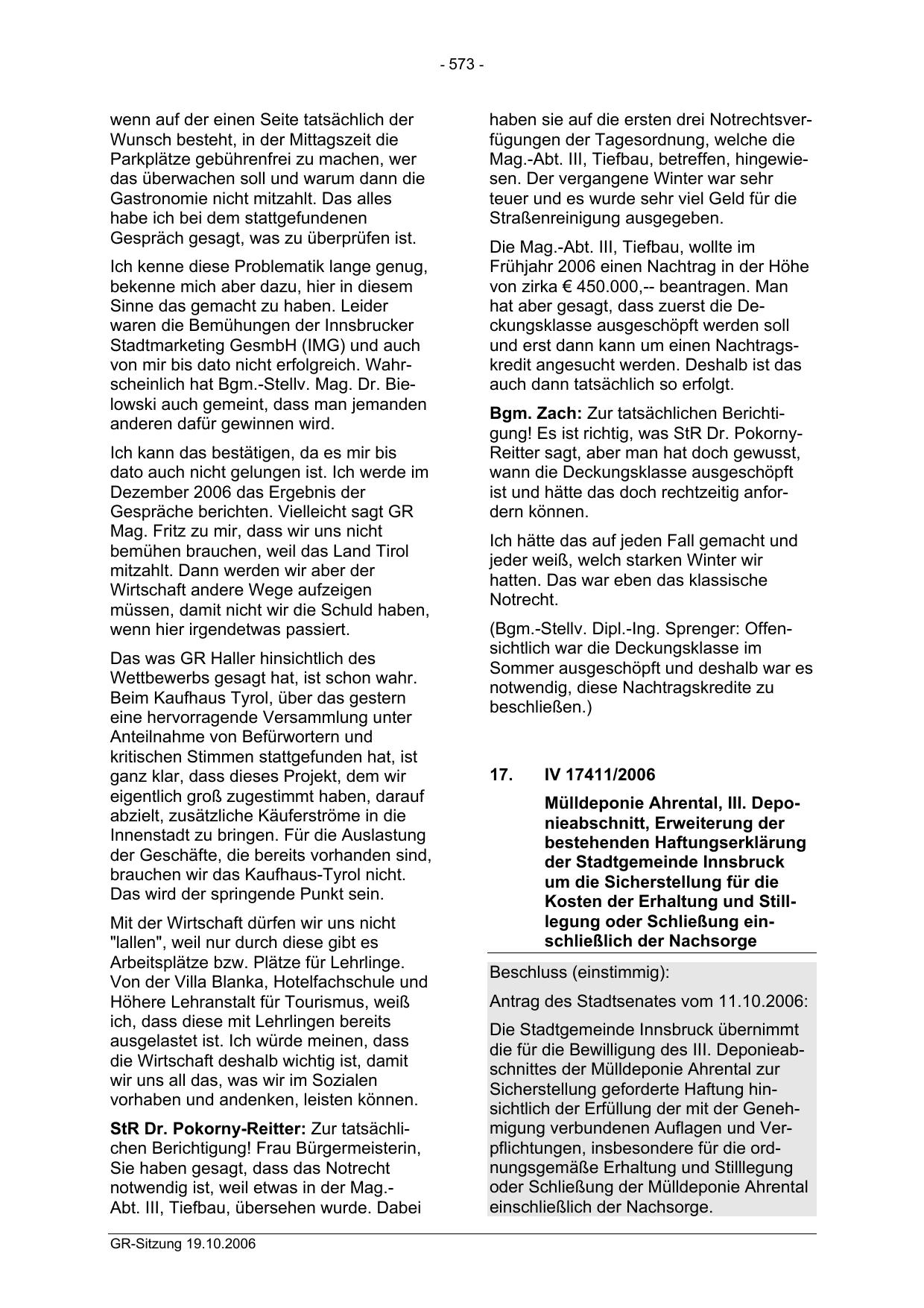Bgm. Zach: Zur tatsächlichen Berichtigung! Es ist richtig, was StR Dr. PokornyReitter sagt, aber man hat doch gewusst,