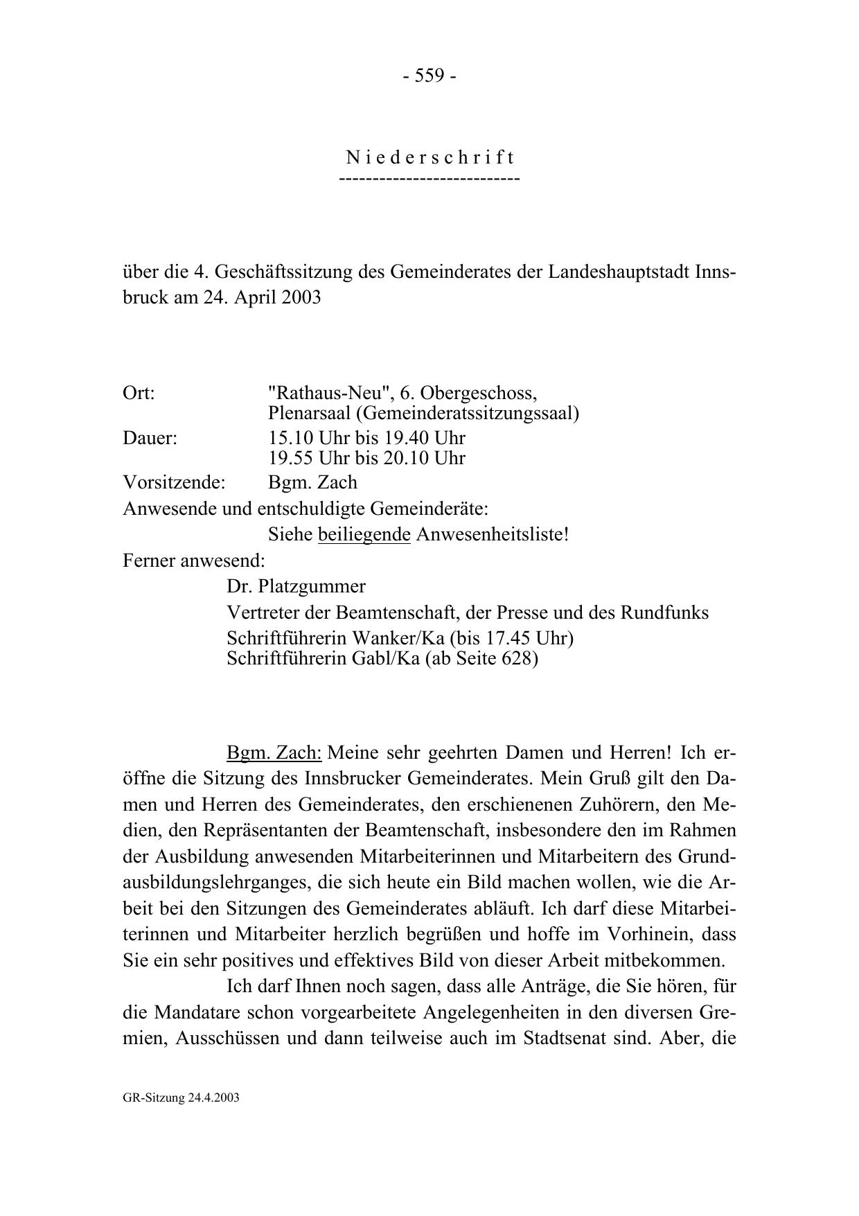 über die 4. Geschäftssitzung des Gemeinderates der Landeshauptstadt Innsbruck am 24. April 2003