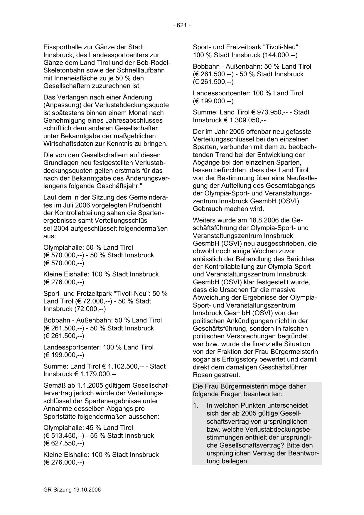 Innsbruck € 1.179.000,-Gemäß ab 1.1.2005 gültigem Gesellschaftervertrag jedoch würde der Verteilungsschlüssel der Spartenergebnisse unter