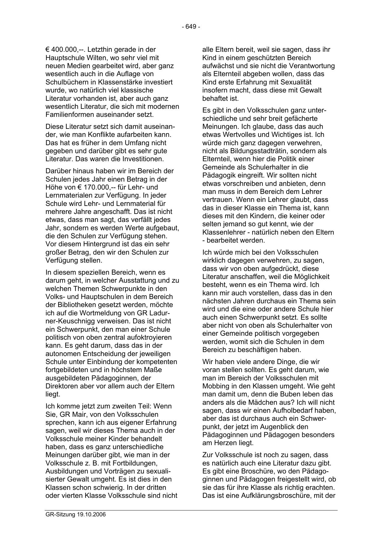 ich auf die Wortmeldung von GR Ladurner-Keuschnigg verweisen. Das ist nicht