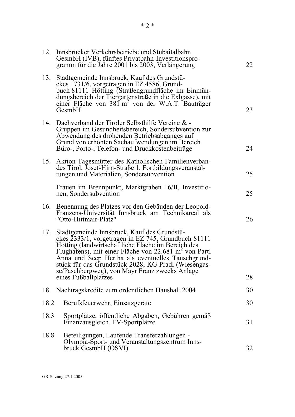 18. Nachtragskredite zum ordentlichen Haushalt 2004