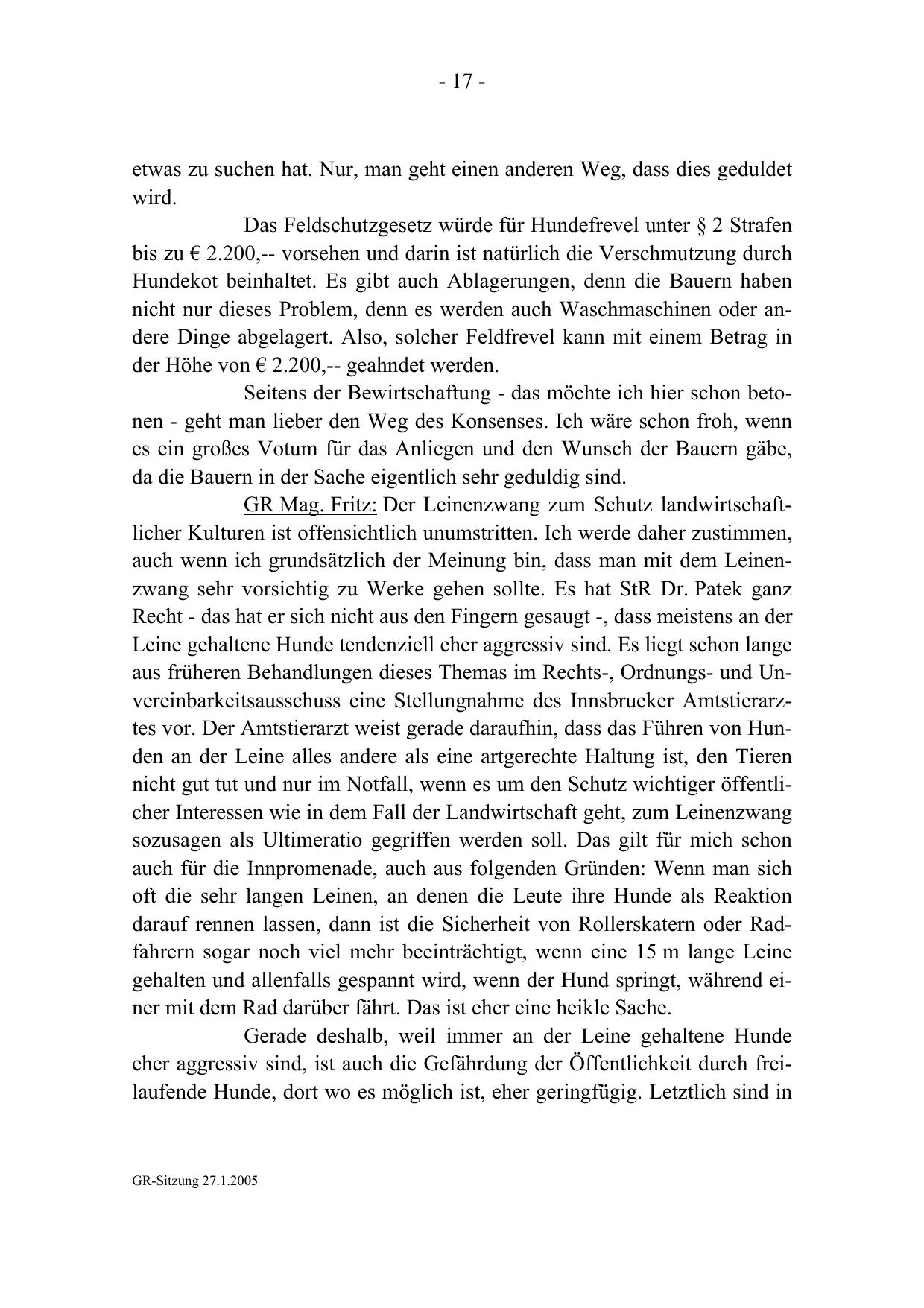 GR Mag. Fritz: Der Leinenzwang zum Schutz landwirtschaftlicher Kulturen ist offensichtlich unumstritten. Ich werde daher zustimmen,