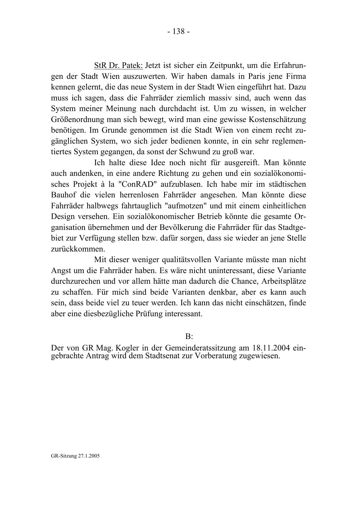 Der von GR Mag. Kogler in der Gemeinderatssitzung am 18.11.2004 eingebrachte Antrag wird dem Stadtsenat zur Vorberatung zugewiesen.