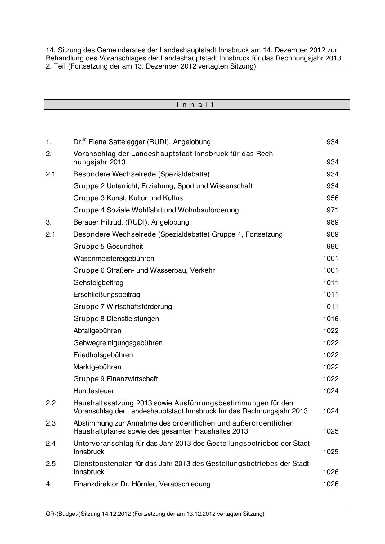 14. Sitzung des Gemeinderates der Landeshauptstadt Innsbruck am 14. Dezember 2012 zur