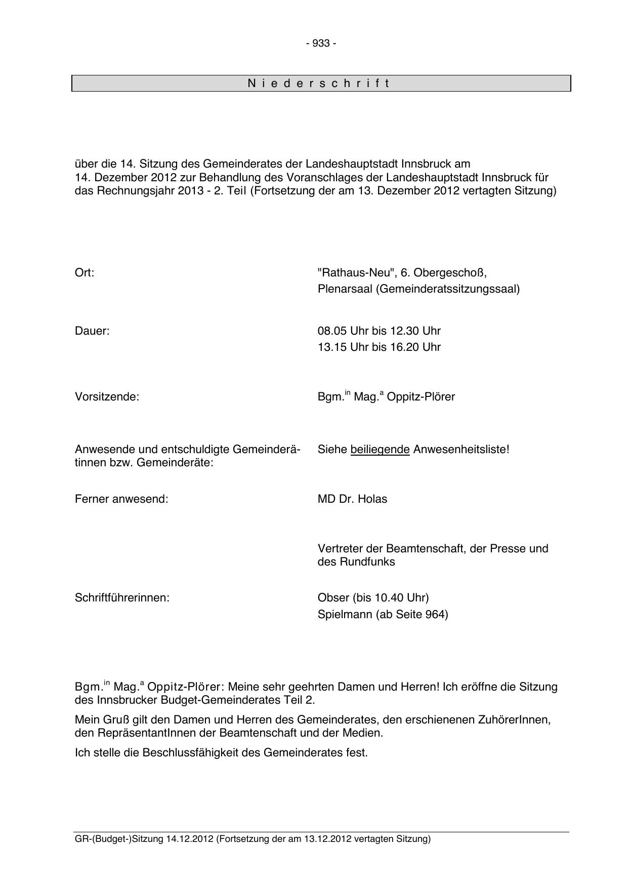 14. Dezember 2012 zur Behandlung des Voranschlages der Landeshauptstadt Innsbruck für