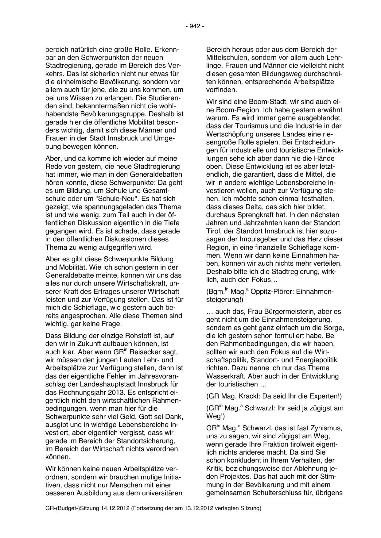 GR-(Budget-)Sitzung 14.12.2012 (Fortsetzung der am 13.12.2012 vertagten Sitzung)