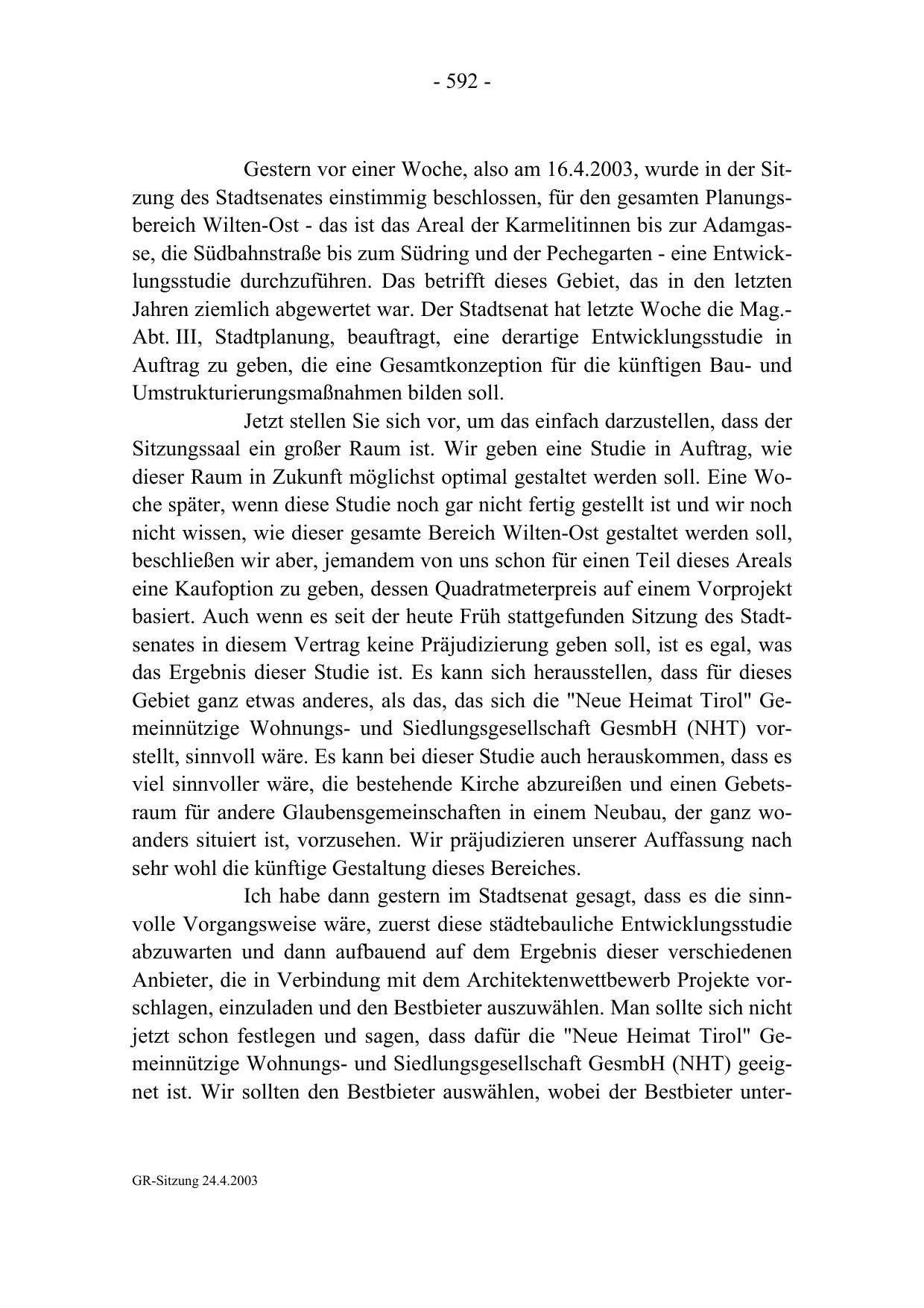 Gestern vor einer Woche, also am 16.4.2003, wurde in der Sitzung des Stadtsenates einstimmig beschlossen, für den gesamten Planungsbereich Wilten-Ost - das ist das Areal der Karmelitinnen bis zur Adamgasse, die Südbahnstraße bis zum Südring und der Pechegarten - eine Entwicklungsstudie durchzuführen. Das betrifft dieses Gebiet, das in den letzten